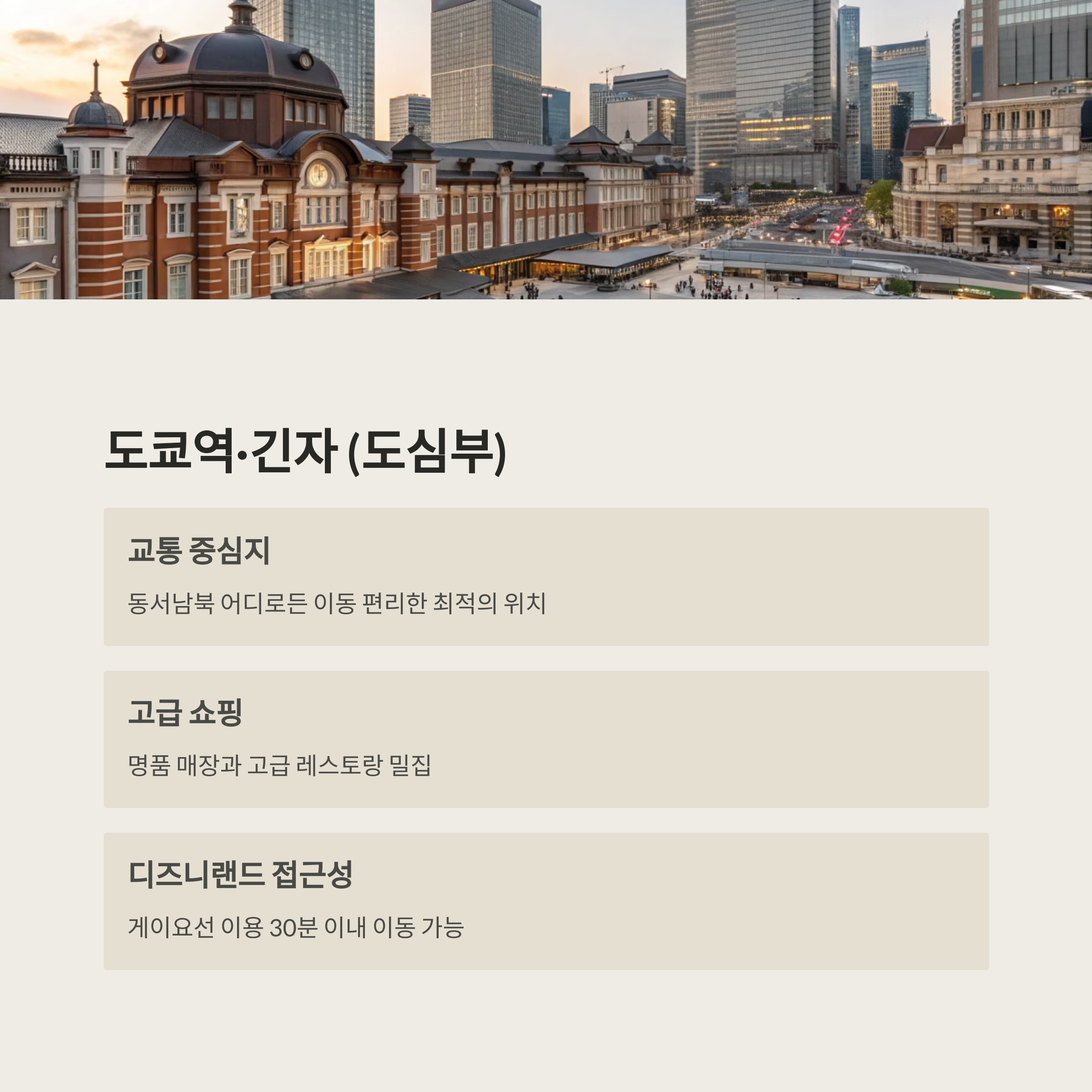 | 지역별 특징 | 쇼핑, 관광, 교통, 가족여행 등 목적에 따라 구분 |