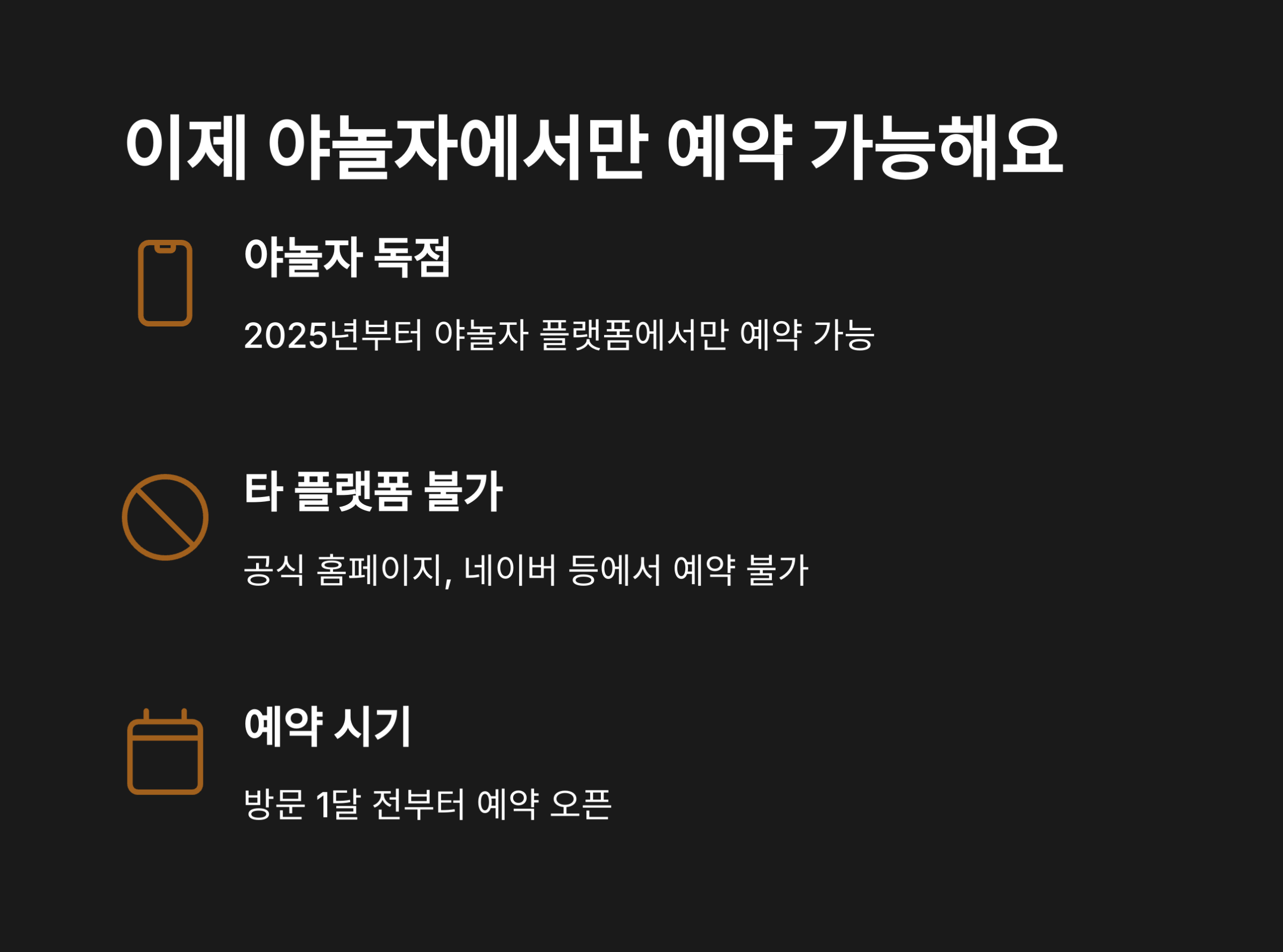 기존의 네이버 예약이나 공식 홈페이지 예매는 완전히 종료되었고, 모든 예약 기능이 야놀자로 통합되었어요.