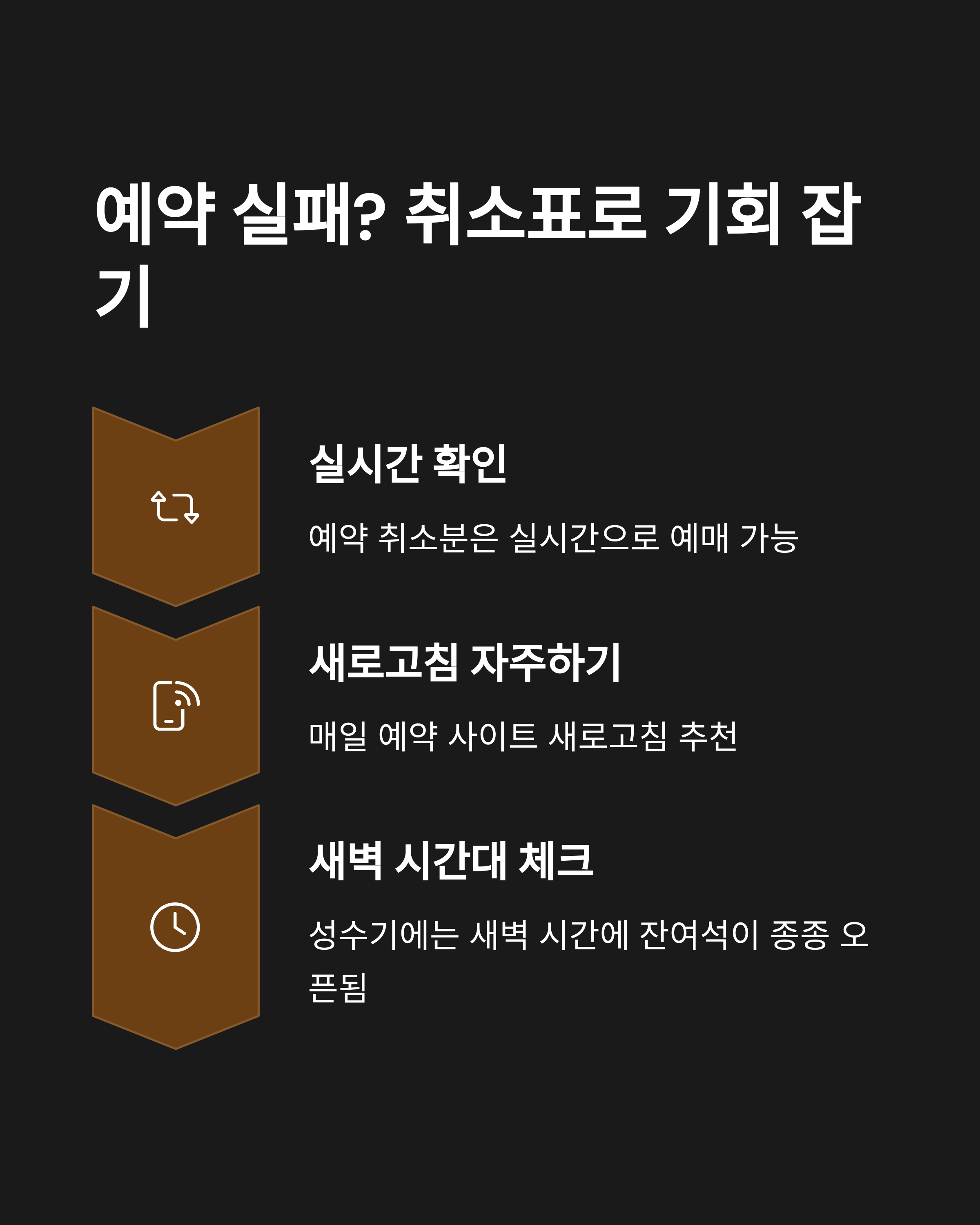 예약 오픈 시간에 맞춰 앱을 켜두고, 미리 로그인 및 정보 입력을 완료해 두면 확률이 높아져요.