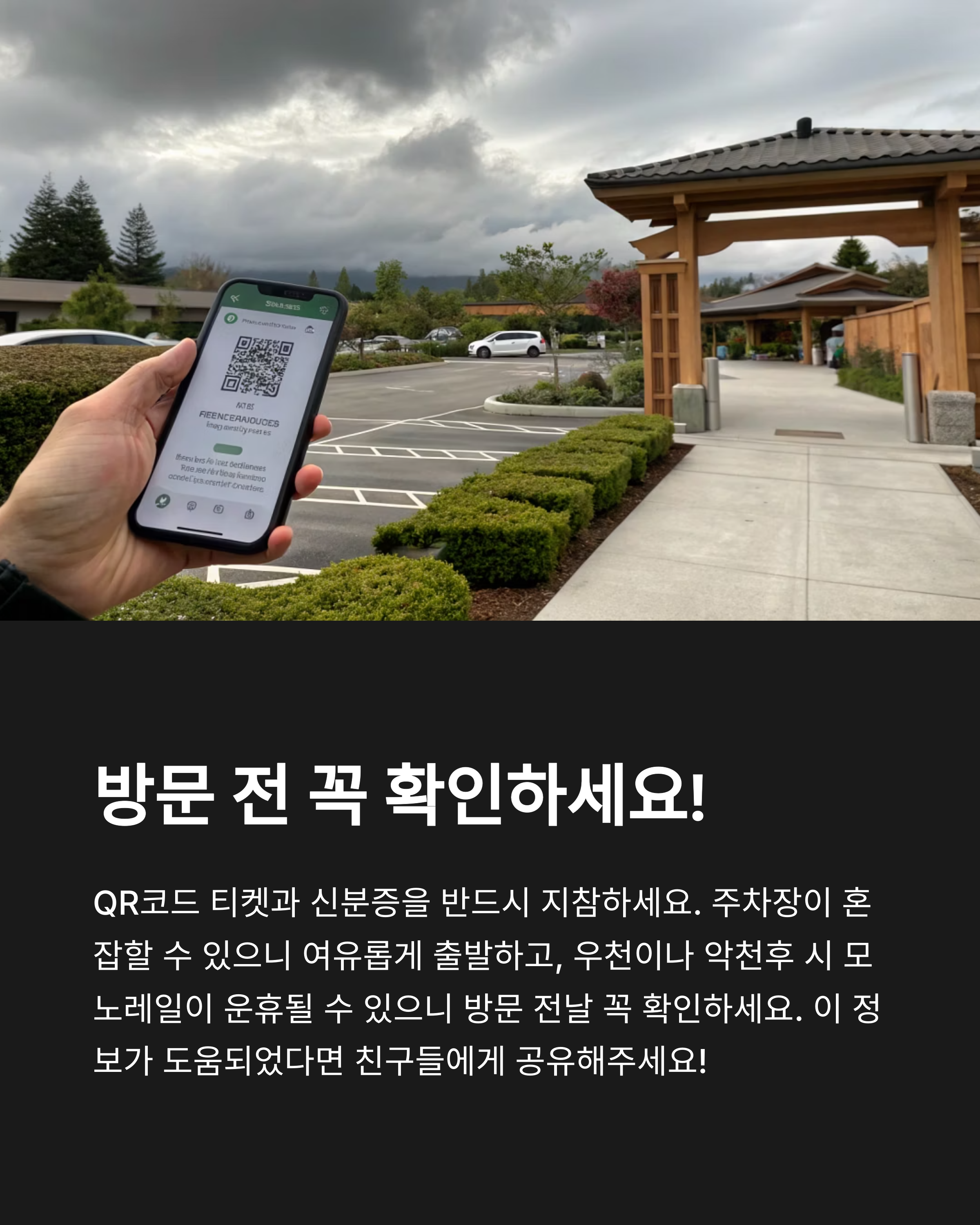 정상 결제를 통해 받은 QR코드만 유효하며, 입장 시간에 맞춰 도착하지 않으면 입장이 제한될 수 있어요.