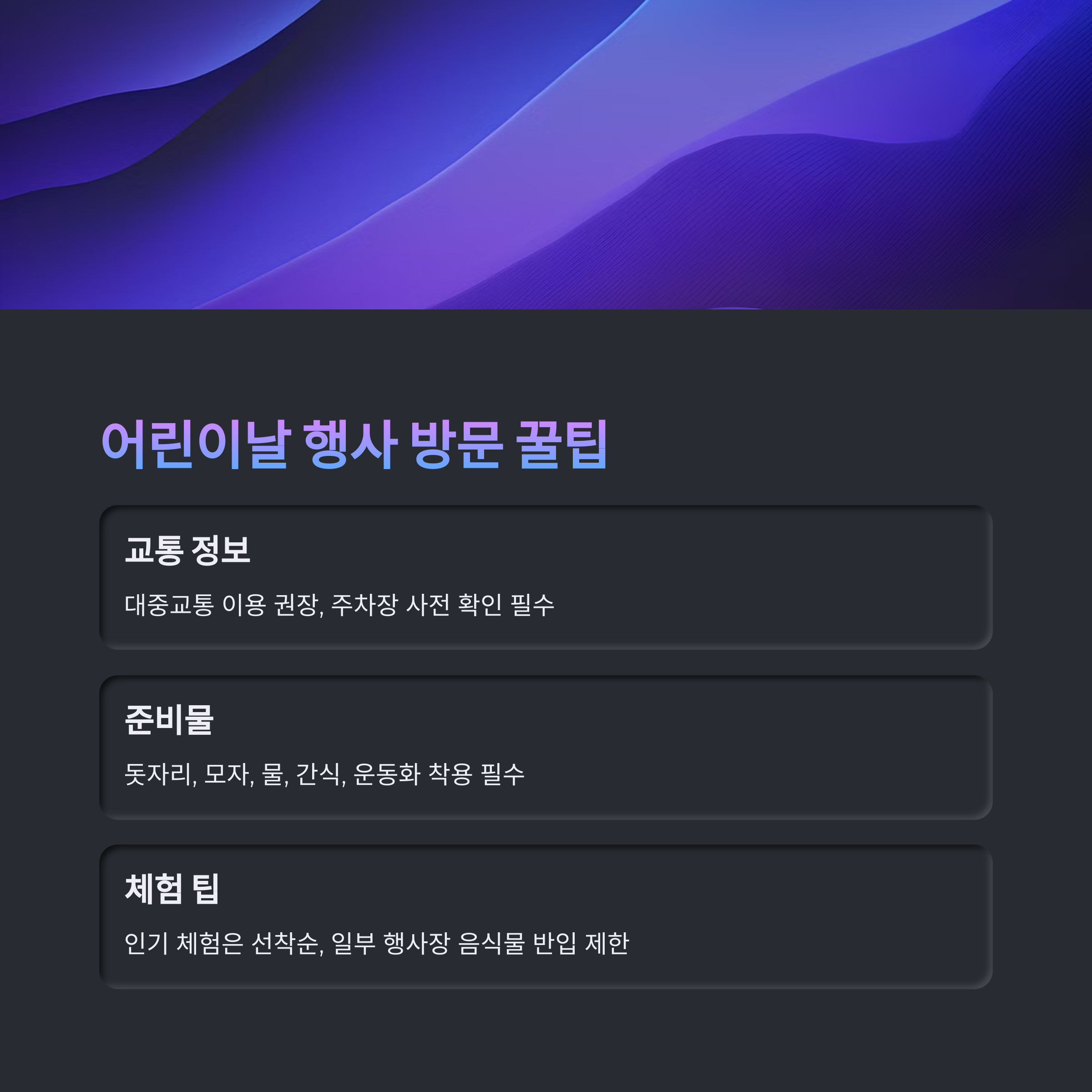 돗자리, 모자, 물, 간식 등을 준비하면 더욱 쾌적하게 즐길 수 있습니다. 일부 체험 부스는 선착순으로 운영되니, 원하는 체험이 있다면 미리 도착해 대기하는 것이 좋습니다. 또한 잔디 보호를 위해 운동화 착용이 필수이며, 일부 행사장에서는 음식물 반입이 제한되므로 유의해야 합니다.