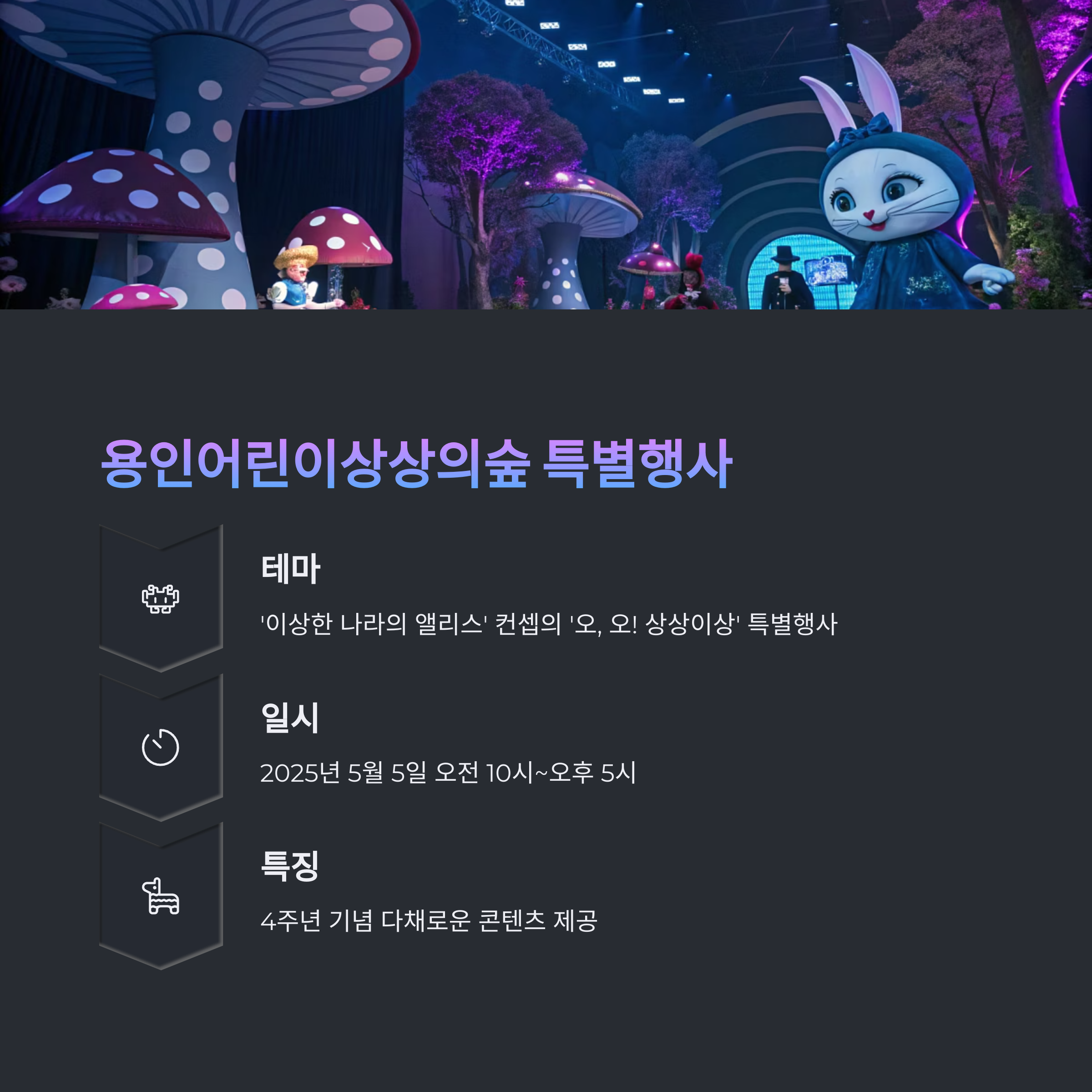 용인어린이상상의숲에서는 2025년 5월 5일 어린이날을 맞아 ‘이상한 나라의 앨리스’를 테마로 한 ‘오, 오! 상상이상’ 특별행사가 진행됩니다. 오전 10시부터 오후 5시까지 다양한 공연과 체험 프로그램이 이어지며, 올해로 4주년을 맞은 이 행사는 더욱 다채로운 콘텐츠를 선보입니다.