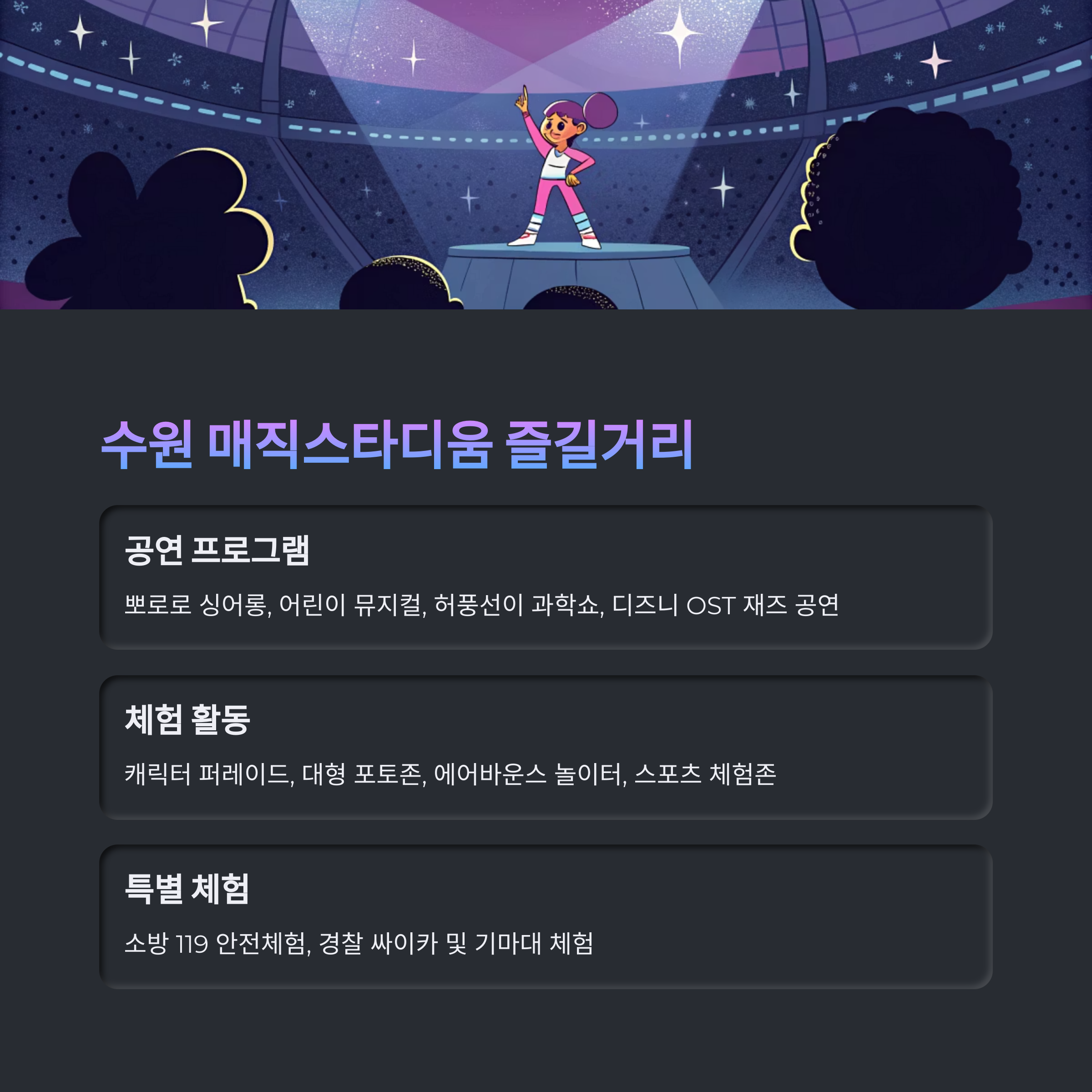 ‘월드컵 매직 스타디움’에서는 인기 캐릭터 뽀로로 싱어롱 공연, 어린이 뮤지컬 '마하와 떠나요 수도송 세계여행', 과학 교육 기반의 ‘허풍선이 과학쇼’, 감성 넘치는 디즈니 OST 재즈 공연 등 다채로운 무대가 준비되어 있습니다. 또한 캐릭터 퍼레이드와 대형 캐릭터 포토존, 쿠키런 포토존, 에어바운스 놀이터 등 아이들이 좋아할 놀거리가 가득합니다. 스포츠 체험존, 소방 119 안전체험, 경찰 싸이카 및 기마대 체험 같은 프로그램도 제공되어 아이들에게 특별한 경험을 선물합니다.