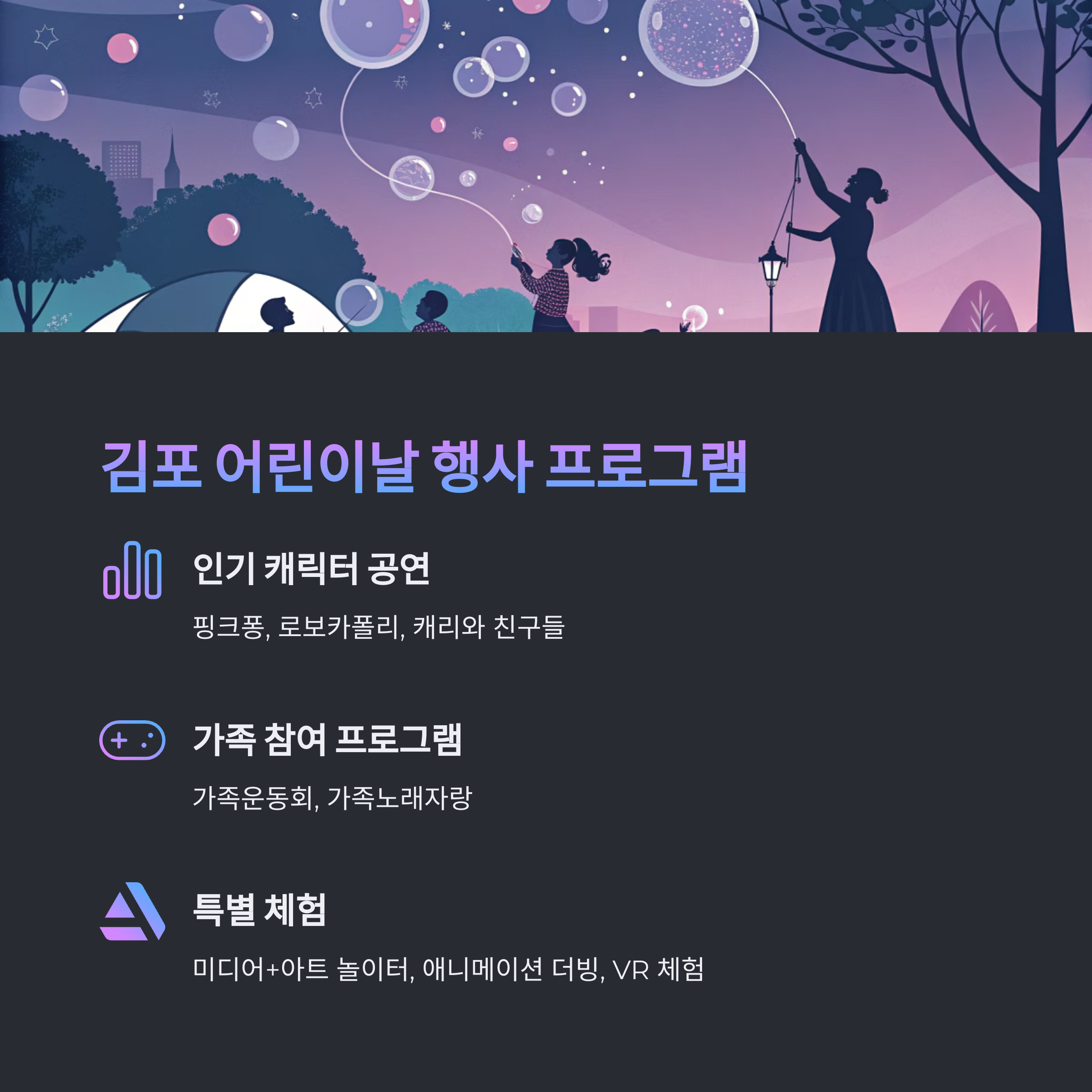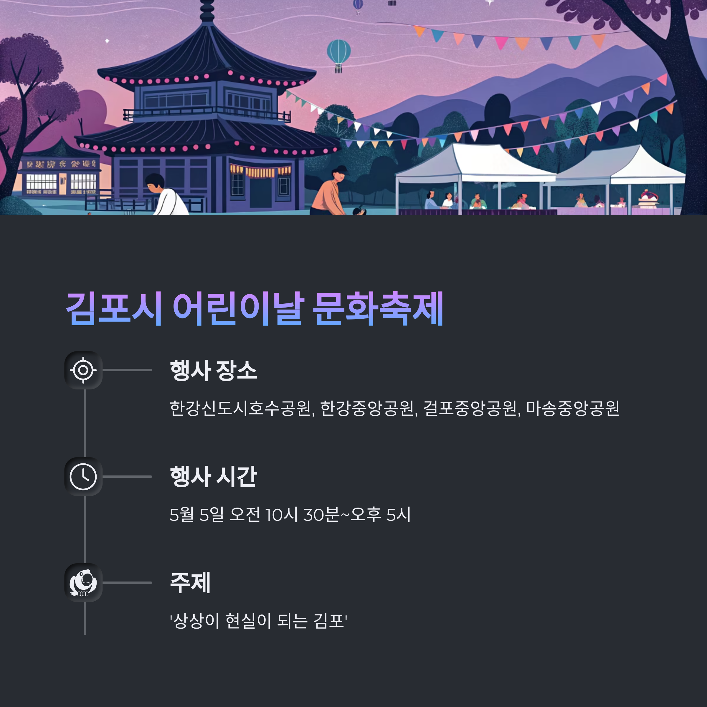 김포시는 2025년 어린이날을 맞아 ‘상상이 현실이 되는 김포’를 주제로 문화축제를 개최합니다. 5월 5일 오전 10시 30분부터 오후 5시까지, 한강신도시호수공원, 한강중앙공원, 걸포중앙공원, 마송중앙공원에서 다양한 행사가 펼쳐집니다. 네 곳의 주요 공원에서 동시에 진행되므로, 가까운 곳을 선택해 편리하게 행사에 참여할 수 있습니다.