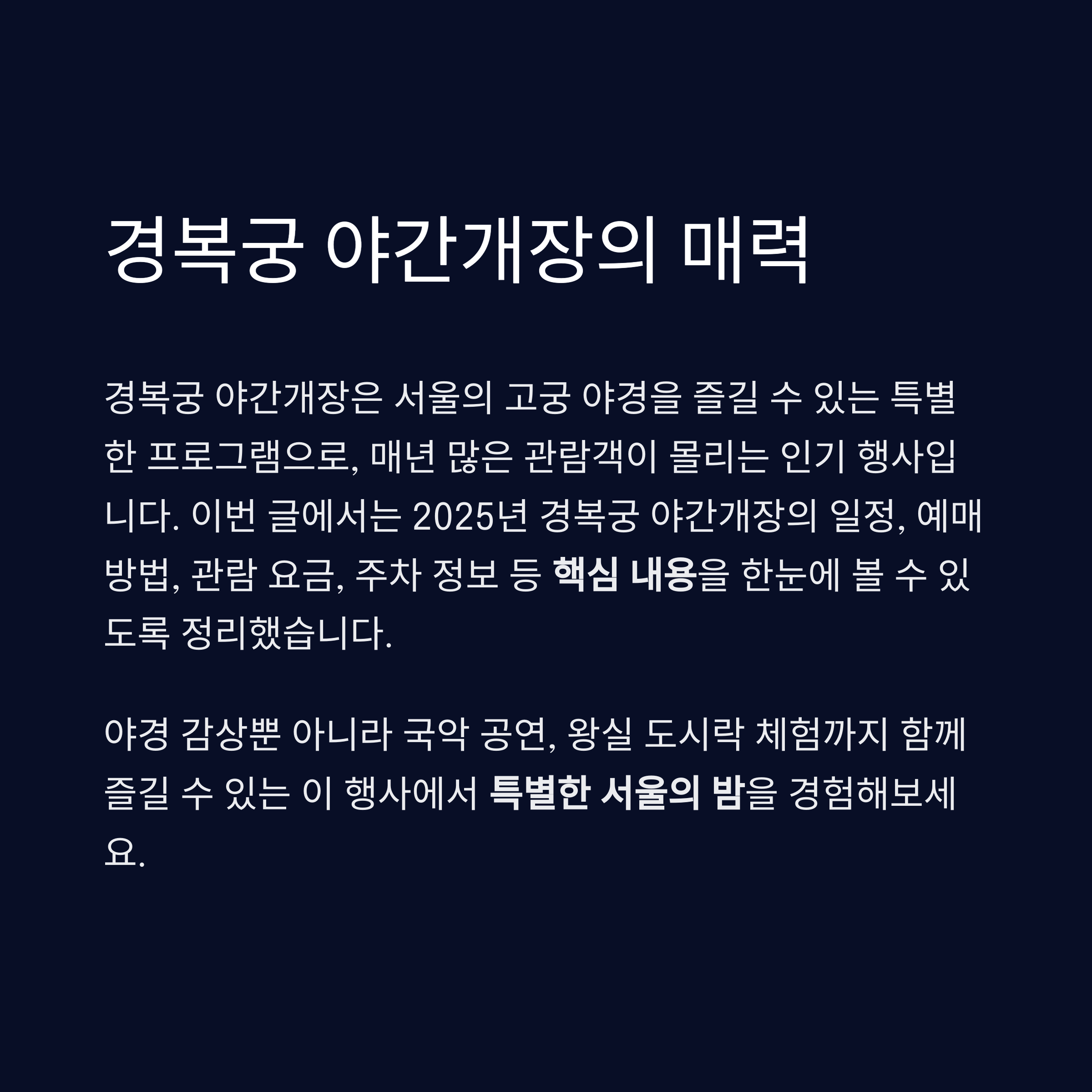 경복궁 야간개장은 서울의 고궁 야경을 즐길 수 있는 특별한 프로그램으로, 매년 많은 관람객이 몰리는 인기 행사입니다. 이번 글에서는 2025년 경복궁 야간개장의 일정, 예매 방법, 관람 요금, 주차 정보 등 핵심 내용을 한눈에 볼 수 있도록 정리했습니다. 야경 감상뿐 아니라 국악 공연, 왕실 도시락 체험까지 함께 즐길 수 있는 이 행사에서 특별한 서울의 밤을 경험해보세요.