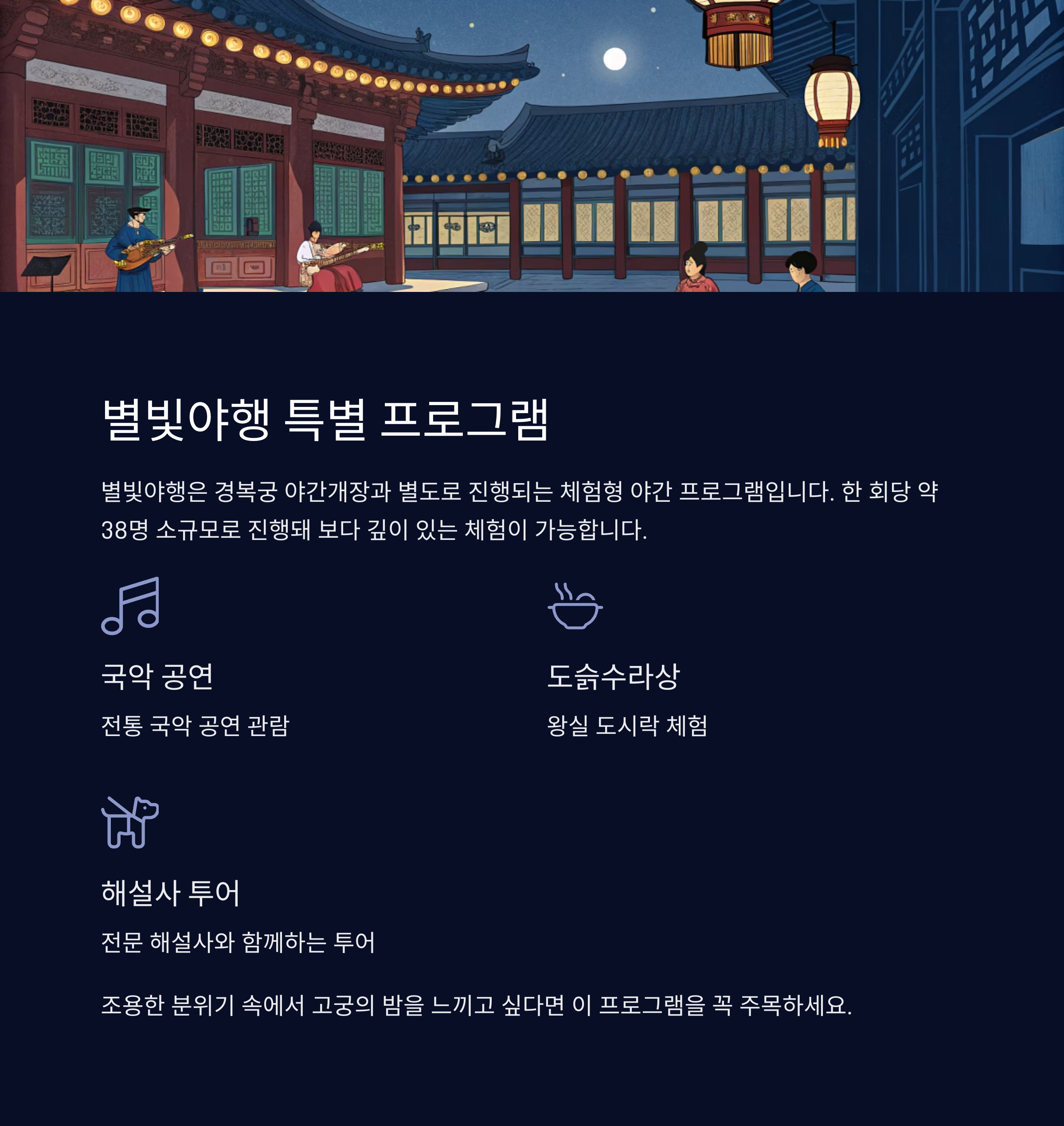별빛야행은 경복궁 야간개장과 별도로 진행되는 체험형 야간 프로그램입니다.