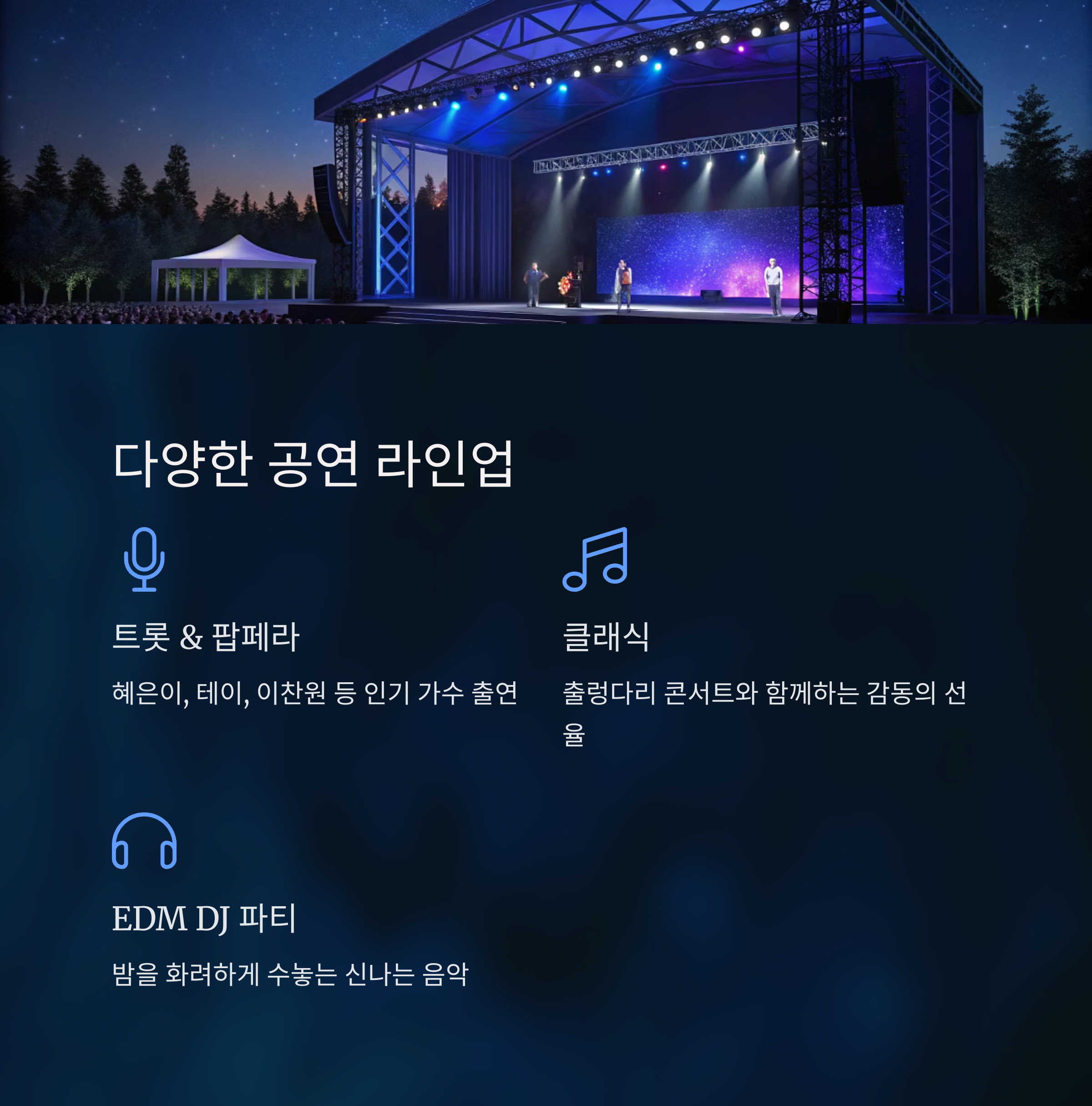 트롯, 팝페라, 클래식, EDM DJ 파티까지 다양한 장르의 공연이 축제 기간 내내 이어집니다.