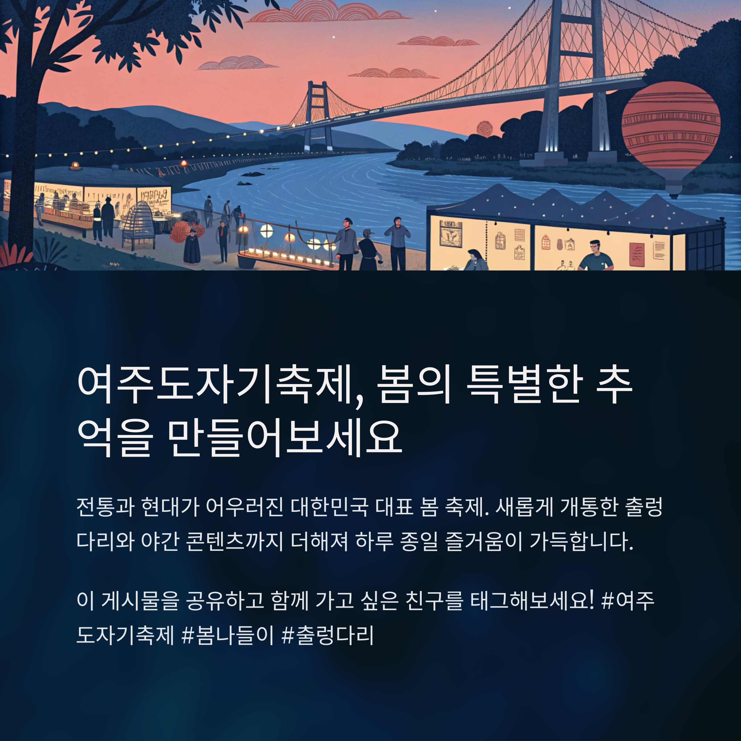 2025년 37회를 맞이하며, 전통 체험과 현대적 감각이 결합된 프로그램, 남한강 출렁다리 개통, 야간 공연과 같은 새로운 즐길 거리로 가족, 연인, 친구 누구나 잊지 못할 시간을 보낼 수 있도록 준비되어 있습니다.