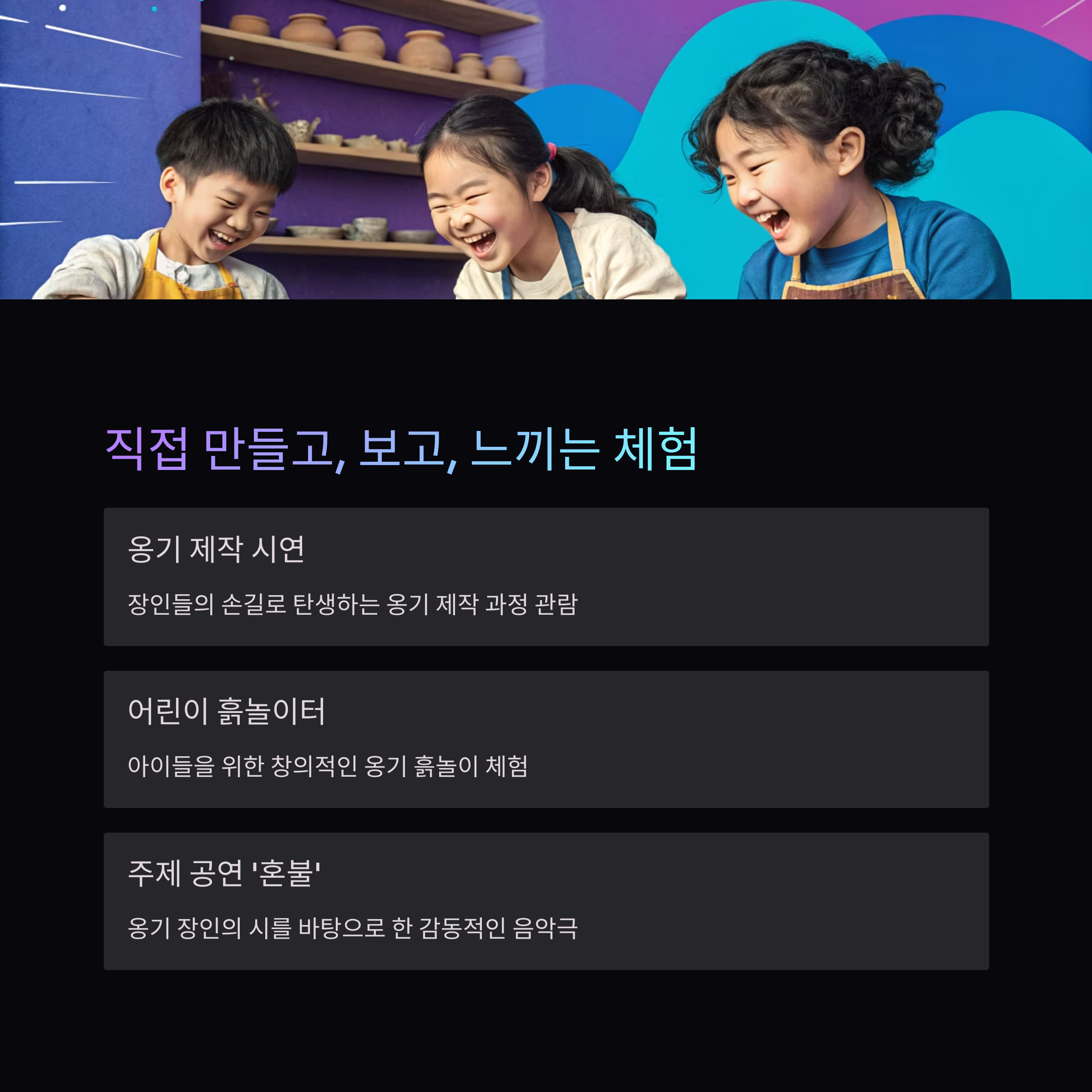 옹기공장의 비밀을 알아보는 공장 투어와, 옹기 공모전 수상작 전시는 옹기의 예술적 가치를 재발견하게 만듭니다.