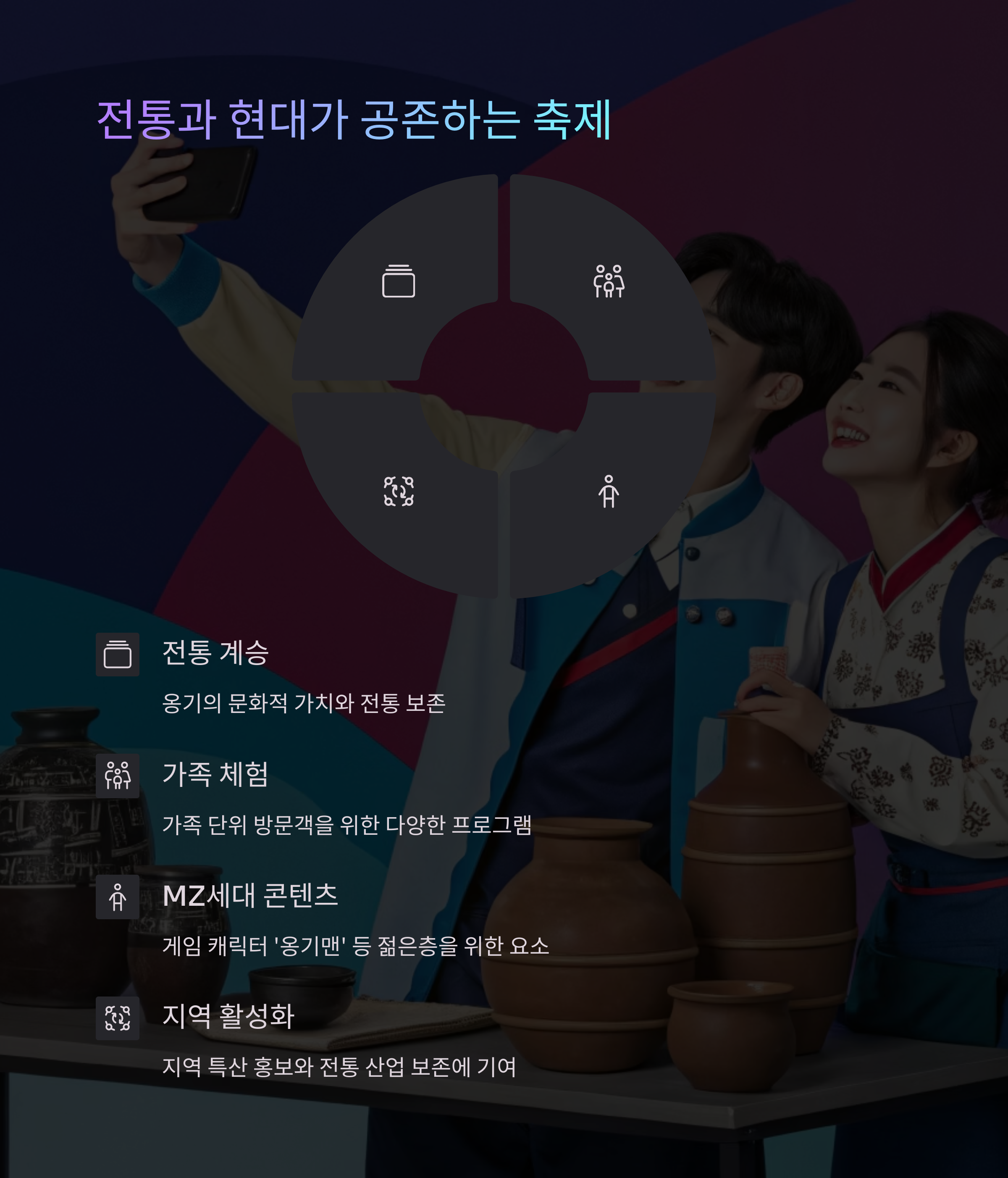 옹기의 가치를 계승하면서도 게임 캐릭터 '옹기맨' 등 젊은층을 위한 콘텐츠를 도입해 MZ세대의 흥미를 유도합니다.