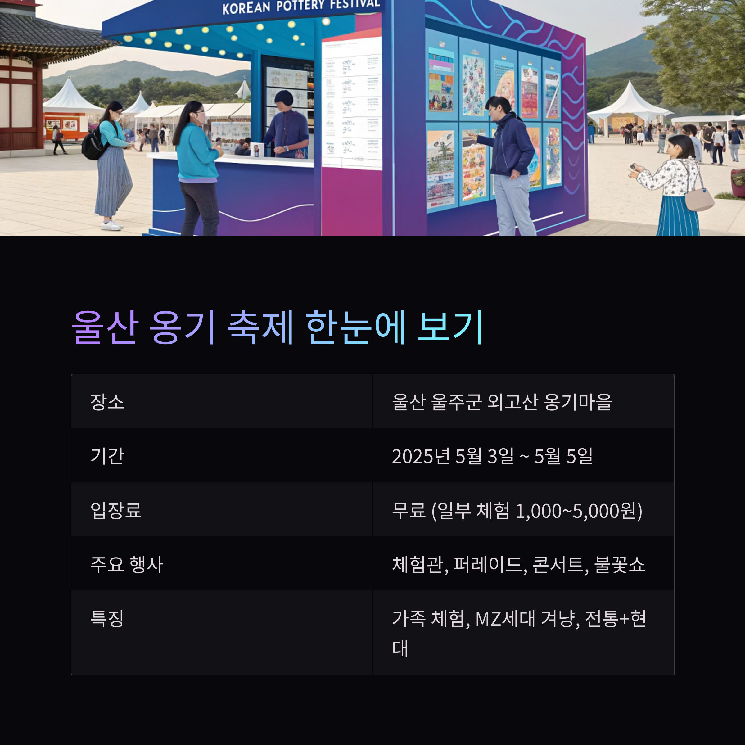 2025년 5월 3일부터 5일까지 울산 울주군 외고산 옹기마을에서 무료로 개최되며, 일부 유료 체험 프로그램과 풍성한 공연, 먹거리, 전시가 준비되어 가족, 친구, 연인 모두가 즐길 수 있는 다채로운 축제의 장이 펼쳐집니다.