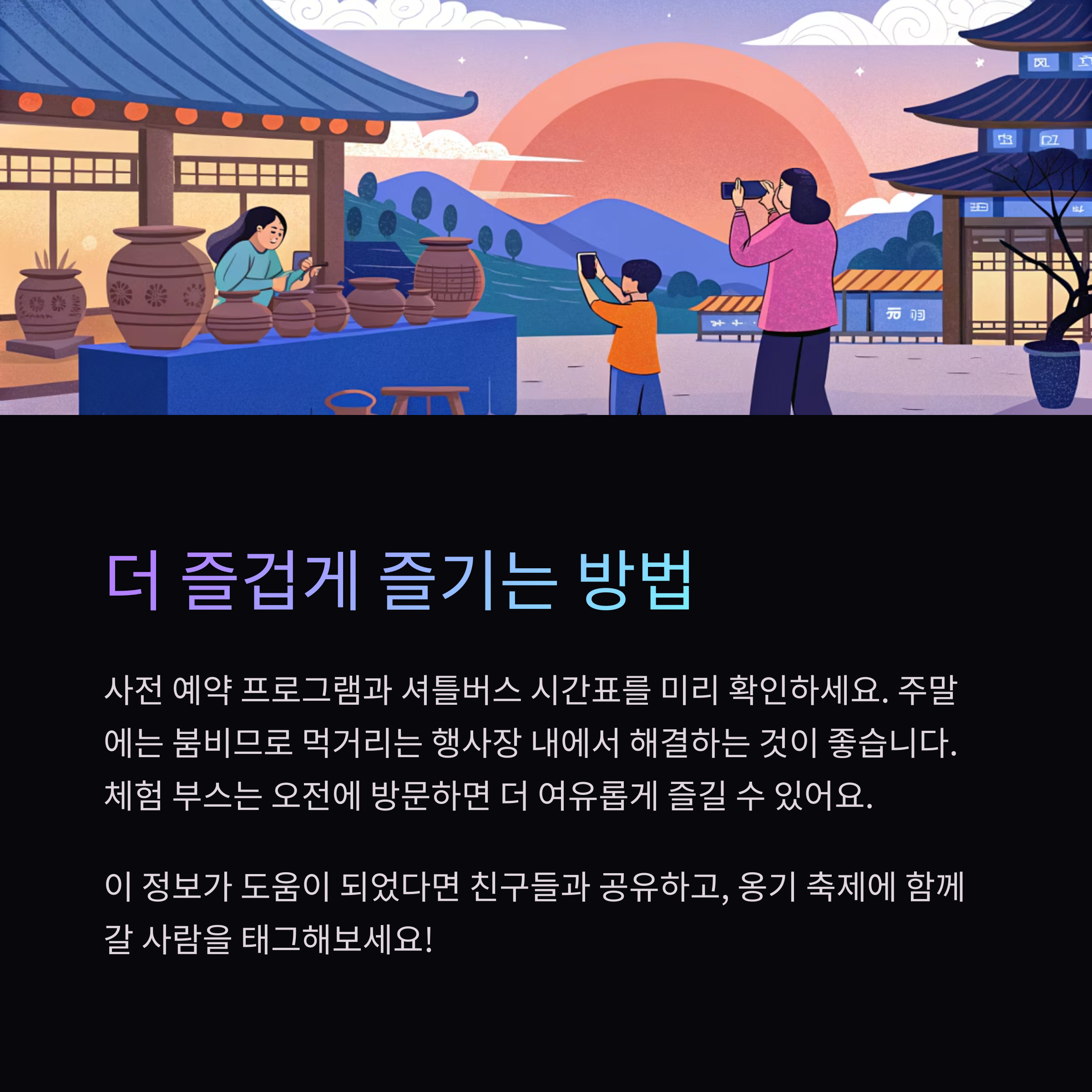 또한 기념품 구매나 체험 부스 참여는 오후보다 오전에 방문하는 것이 훨씬 여유롭습니다.