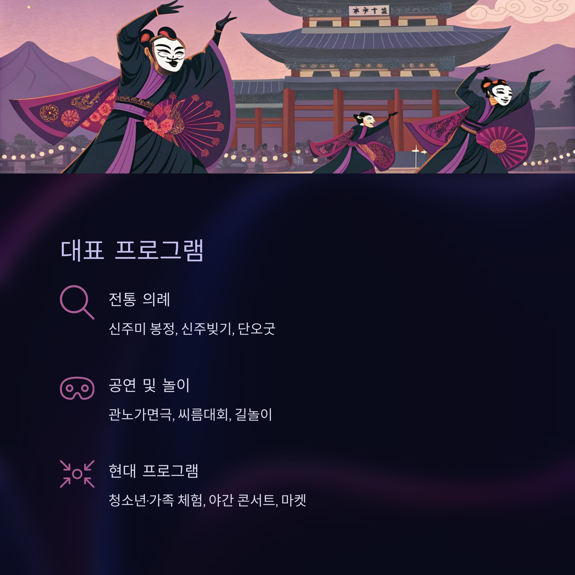 제사의식(단오굿), 관노가면극, 씨름대회 등 60여 개 전통 프로그램과 함께