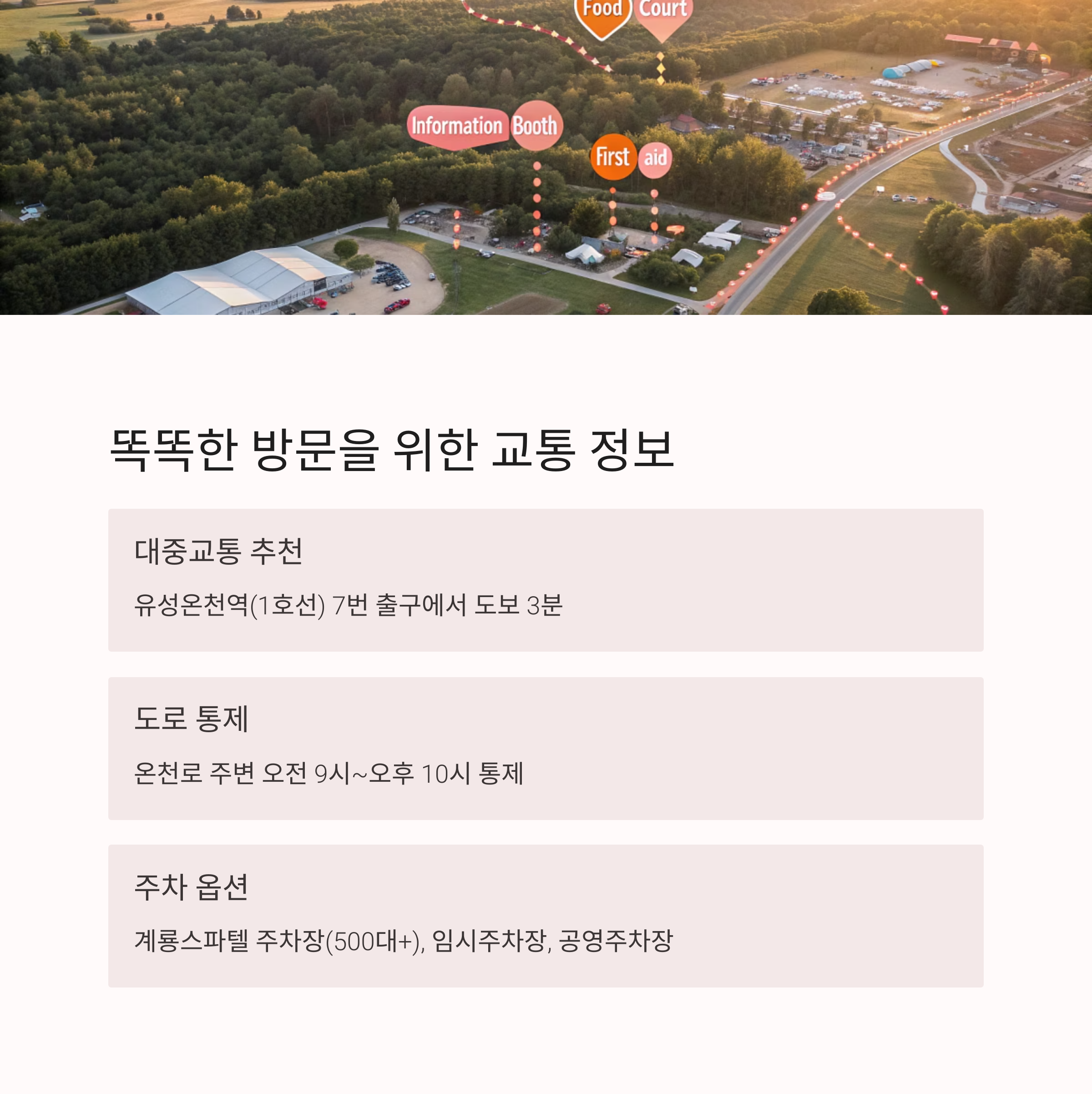 | 계룡스파텔 주차장 | 계룡스파텔 내(500대 이상) | 유료(투숙객 무료) | 축제장과 가장 가까움 |