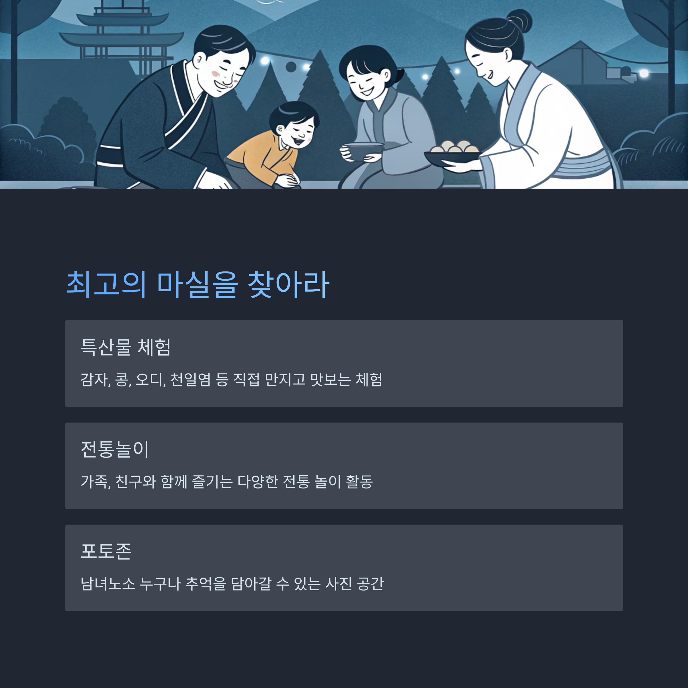 | 체험마실존 | 전통놀이, 특산물 체험 |