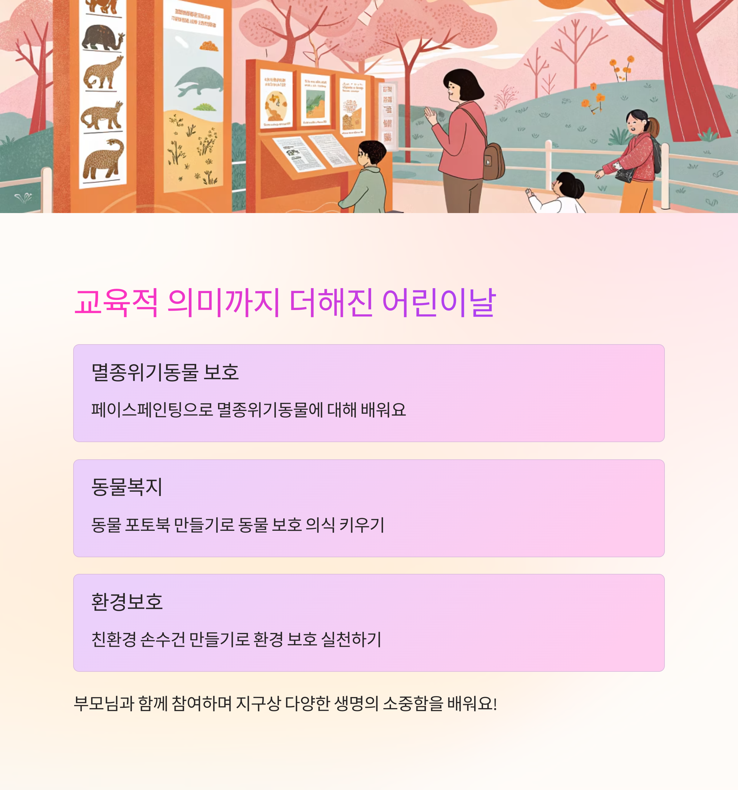 - 오전: 동물원 입장 → 동물 포토북·페이스페인팅 등 체험 프로그램 참가