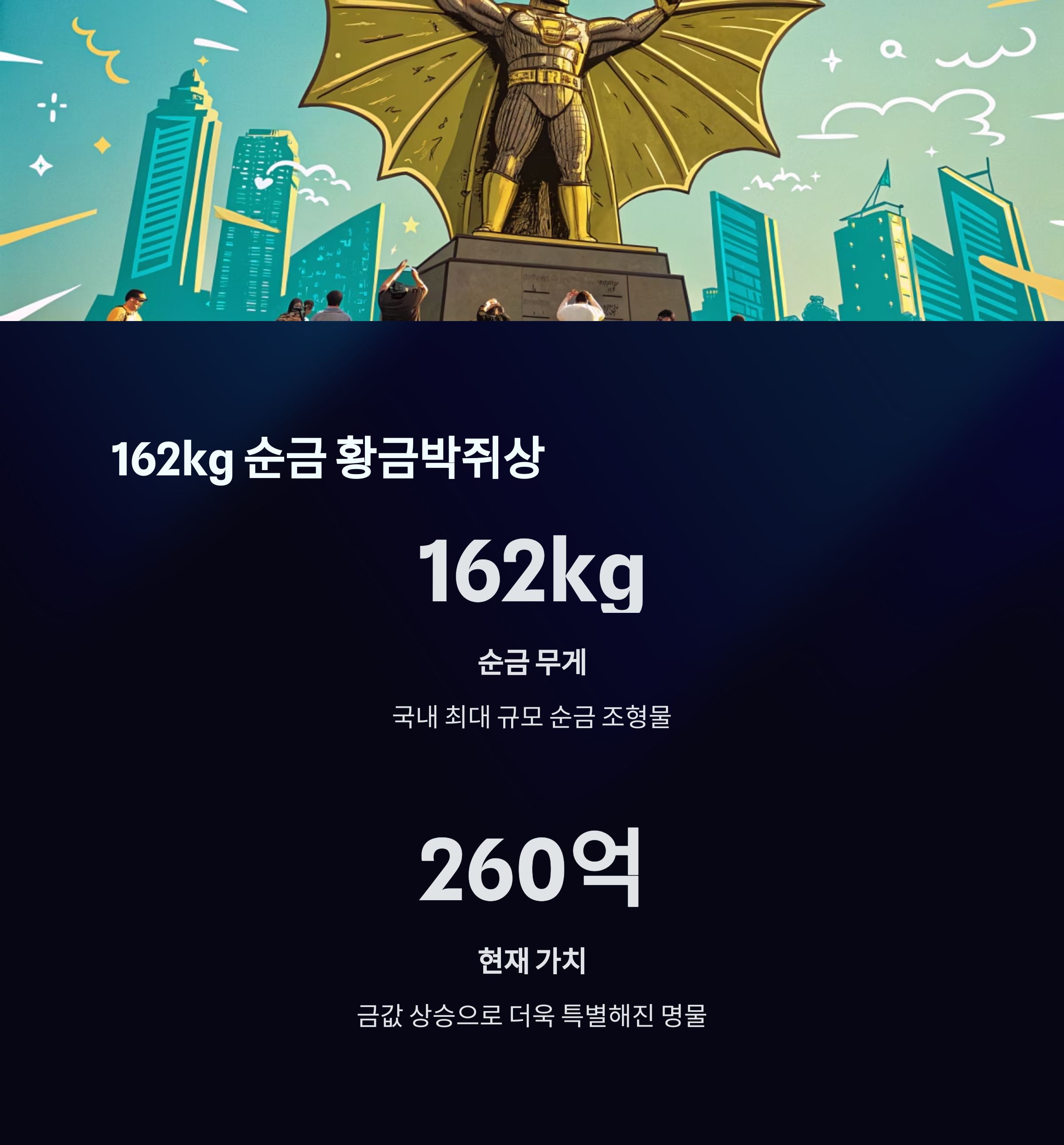 또 하나 주목할 것은 황금박쥐상입니다. 이 조형물은 순금 162kg으로 만들어졌으며 그 가치는 약 260억 원에 달합니다. 관광객들은 이곳에서 기념사진을 찍으며 특별한 추억을 남깁니다. 최근 금값이 상승하면서 황금박쥐상에 대한 관심도 높아졌고, '인생샷' 명소로 입소문이 났습니다. 축제장을 찾는다면 반드시 방문해보길 추천합니다.