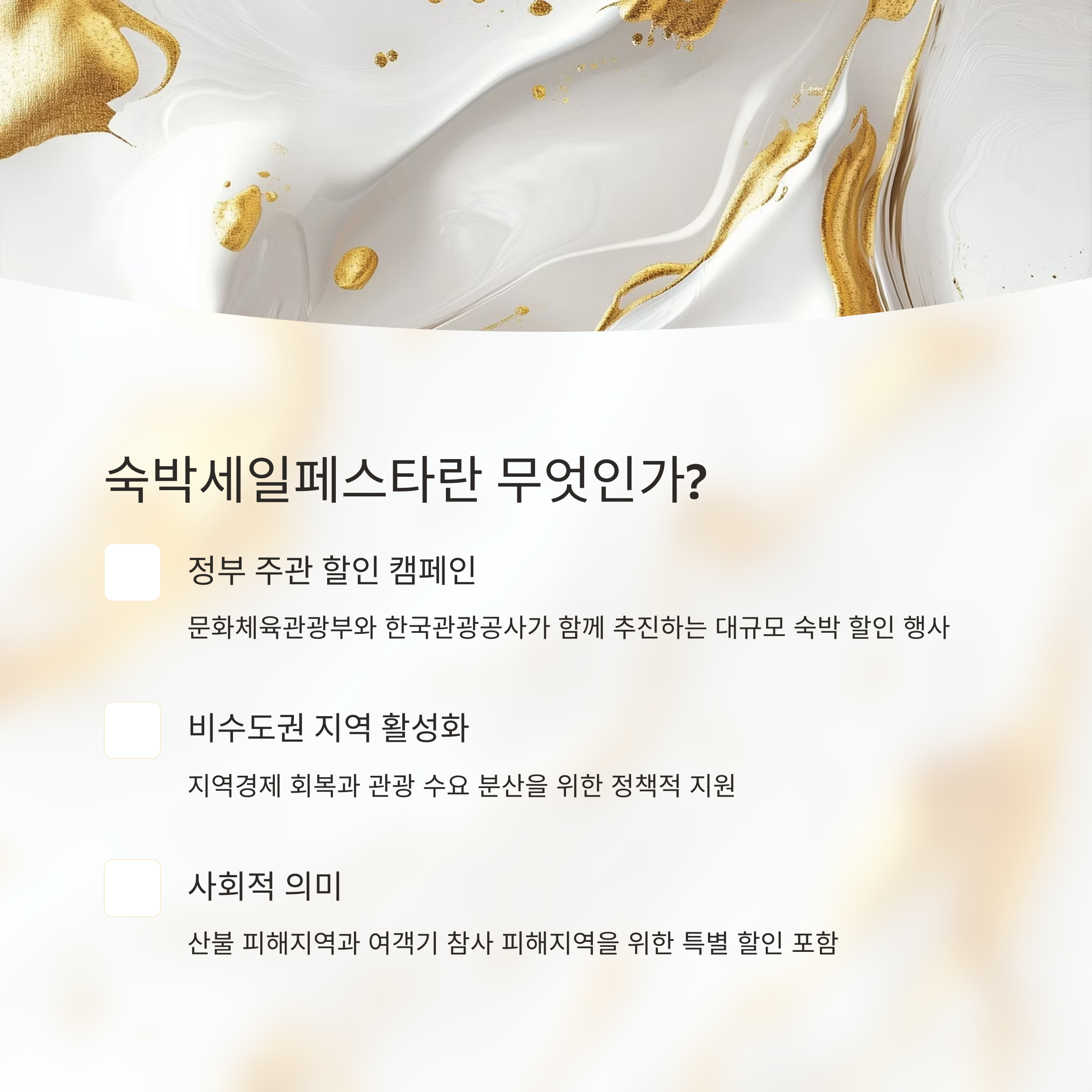 문화체육관광부와 한국관광공사는 2025년 여름 휴가철을 앞두고 국민의 국내 여행을 장려하기 위해 ‘숙박세일페스타’를 5월 28일부터 진행합니다. 총 40만 장의 숙박할인권이 제공되며, 지역 경제 활성화와 국민의 여행 부담을 줄이기 위한 목적을 담고 있습니다.