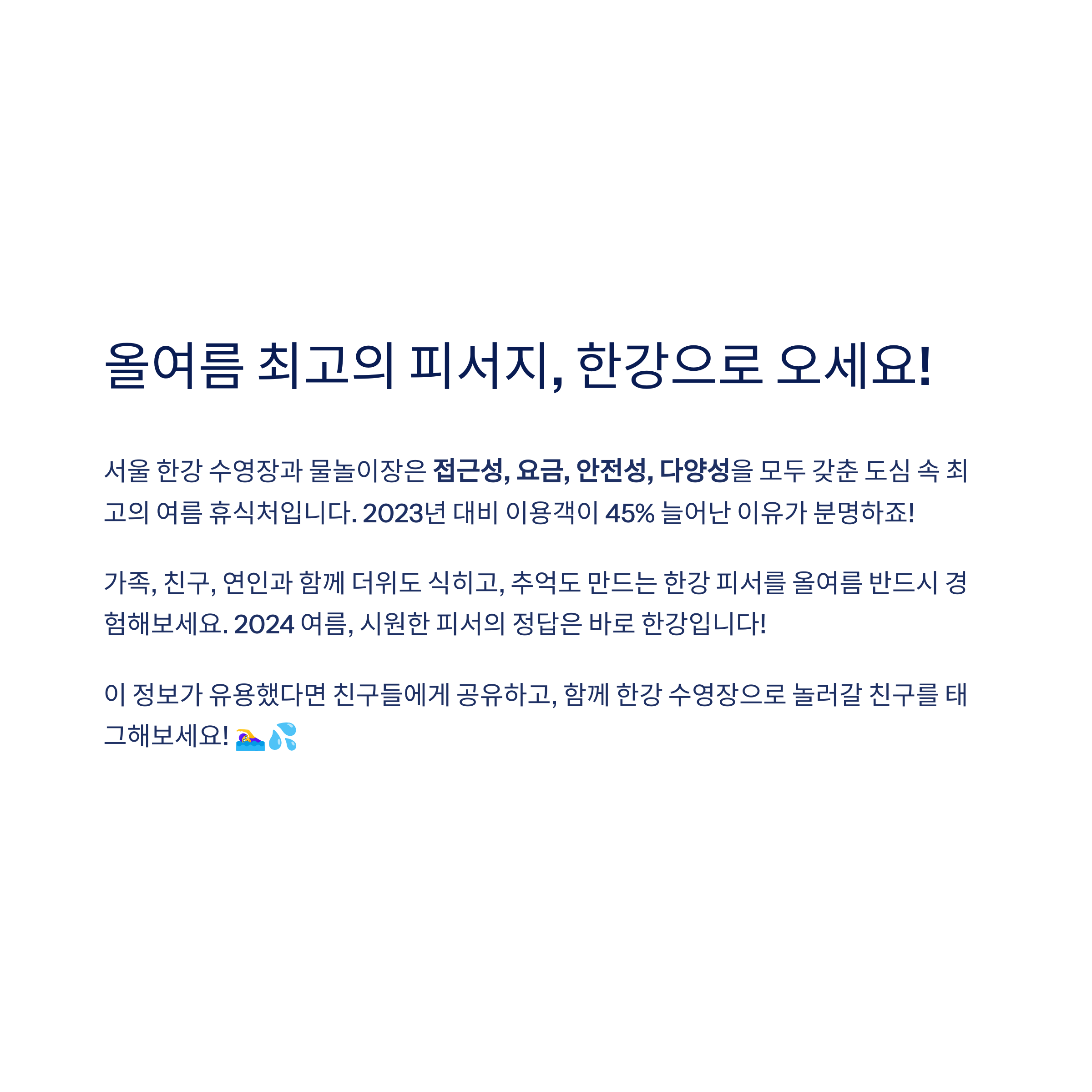 서울 한강 수영장과 물놀이장은 접근성, 요금, 안전성, 다양성을 모두 갖춘 도심 속 최고의 여름 휴식처입니다. 2023년 대비 이용객이 45% 늘어난 이유가 분명하죠. 가족, 친구, 연인과 함께 더위도 식히고, 추억도 만드는 한강 피서를 올여름 반드시 경험해보세요.