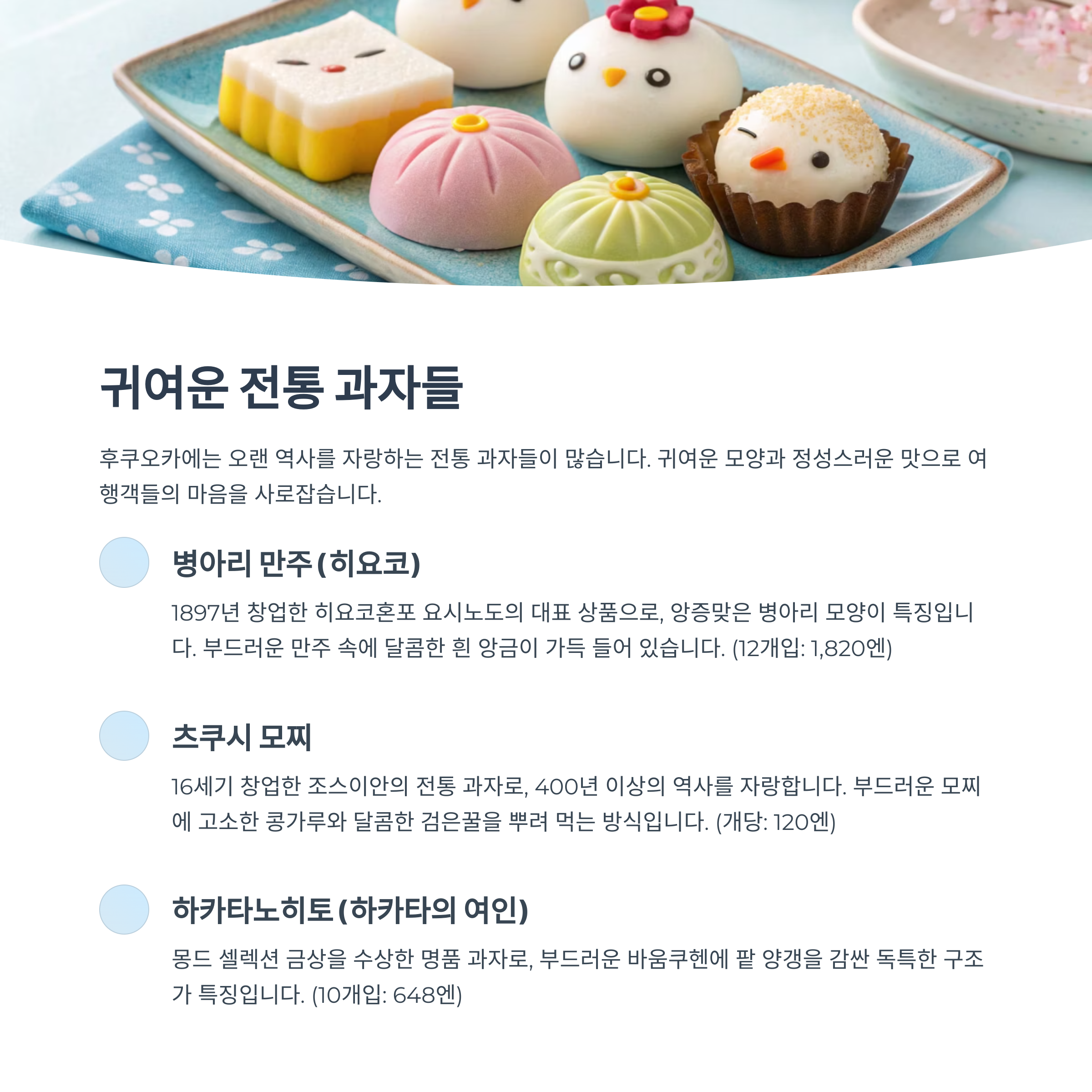 - 특징: 부드러운 만주 속에 달콤하고 촉촉한 흰 앙금이 가득 들어 있어 남녀노소 모두에게 사랑받는 맛입니다. 귀여운 외형 덕분에 선물하는 즐거움이 더하며, 계절에 따라 다양한 한정 맛이 출시되어 수집하는 재미도 있습니다.