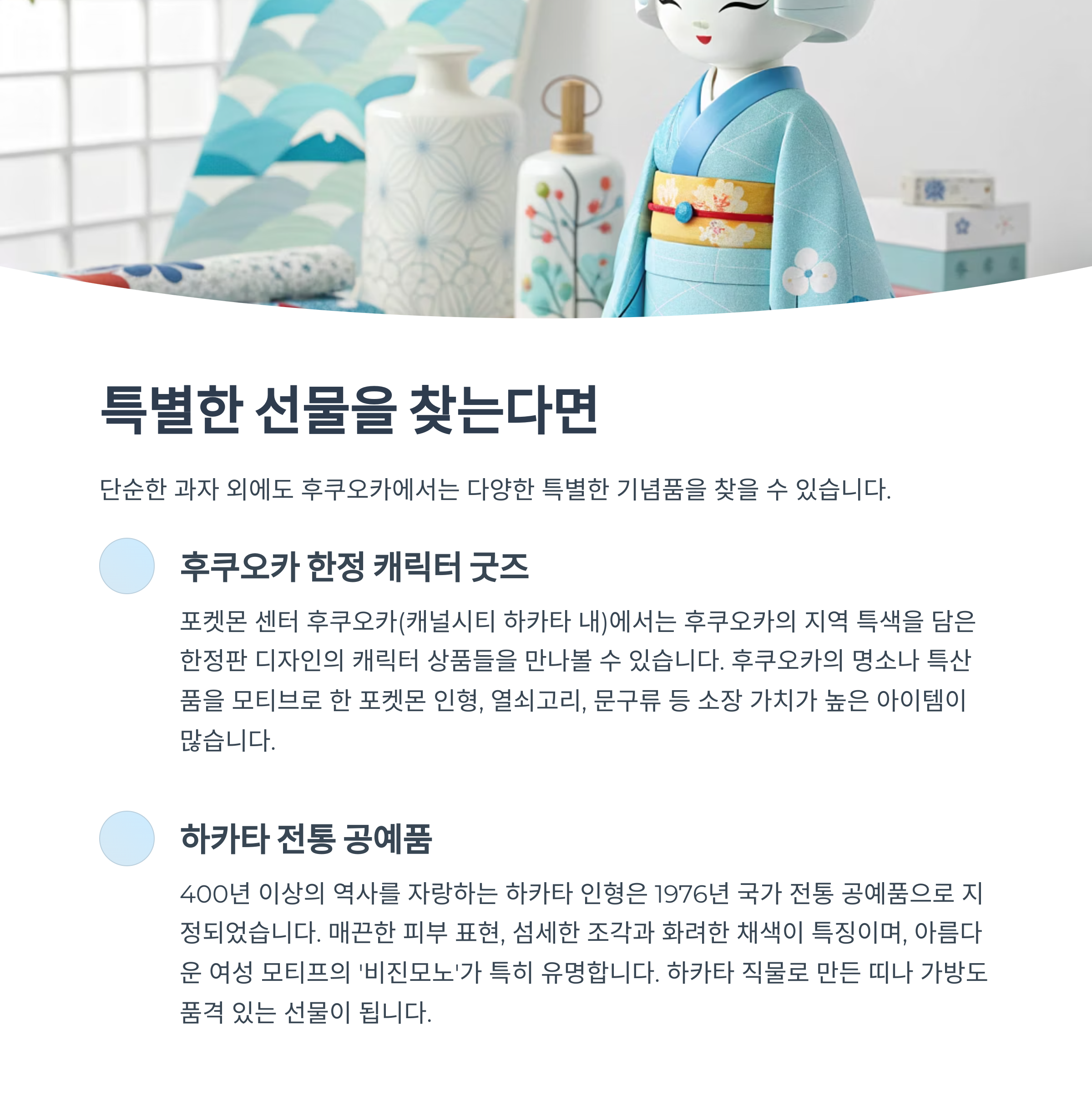 - 하카타 인형: 400년 이상의 역사를 자랑하며 1976년 국가 전통 공예품으로 지정된 하카타 인형은 후쿠오카의 자부심입니다. 매끈하고 뽀얀 피부 표현, 섬세한 조각과 화려한 채색이 특징이며, 아름다운 여성 모티프의 '비진모노'가 특히 유명합니다.