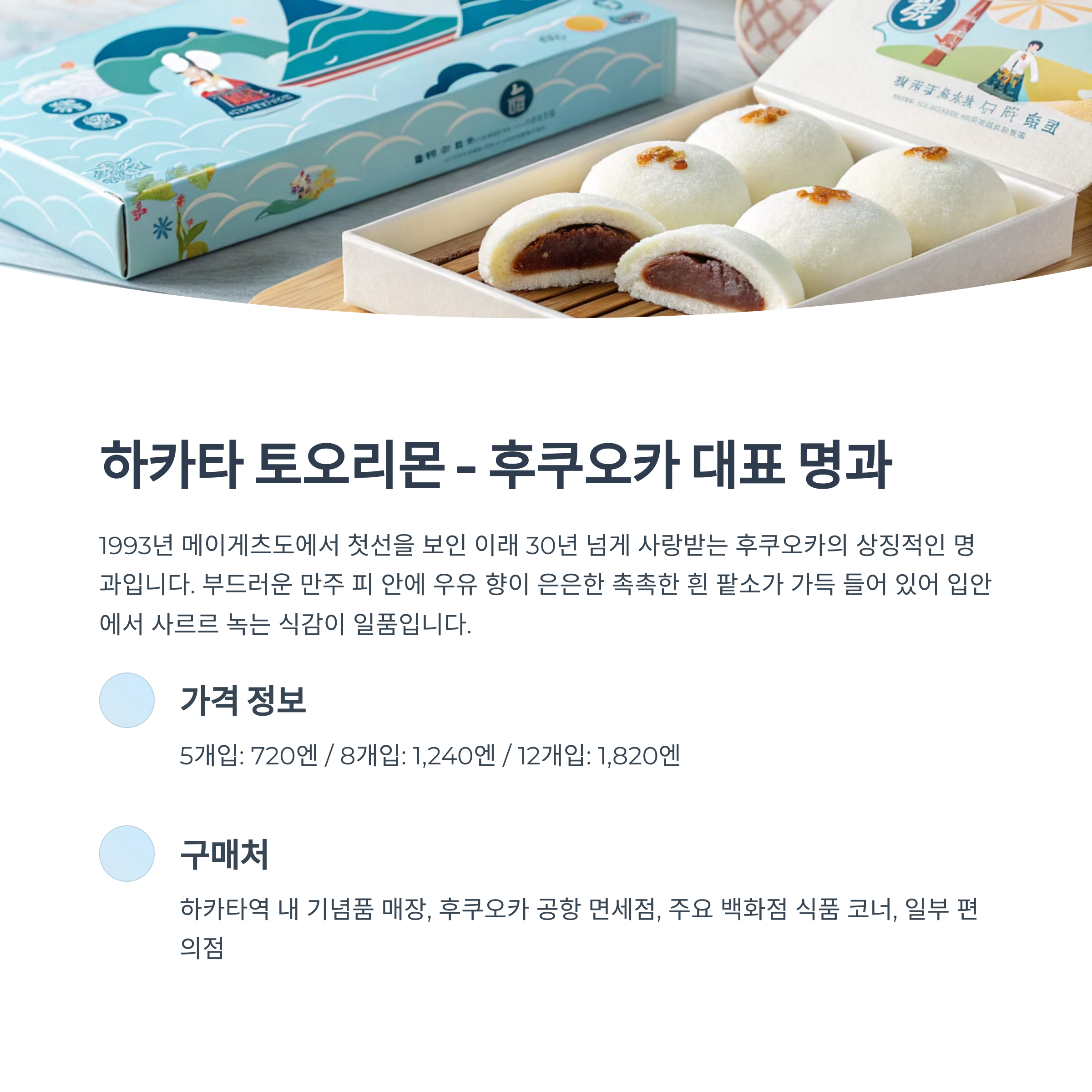 - 구매처: 하카타역 기념품 매장, 주요 백화점 식품 코너, 후쿠오카 시내 기념품점.