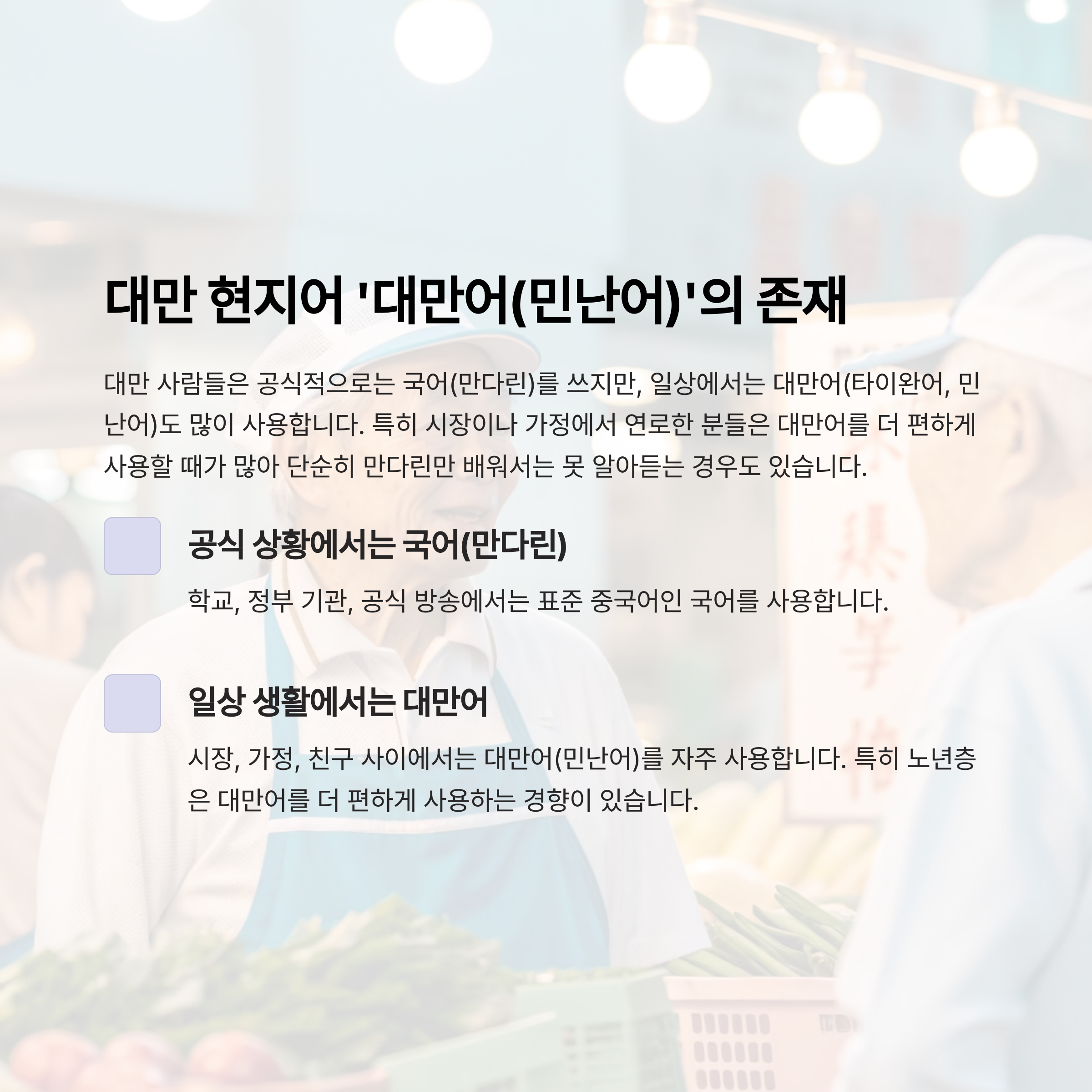 대만에서는 중국어만 통할까요? 대만어도 알아야 하나요?대만은 공식 언어로 만다린(국어, 중국 표준어)을 사용하지만시장이나 로컬 식당, 연세가 있으신 분들 사이에서는대만어(타이완어, 민