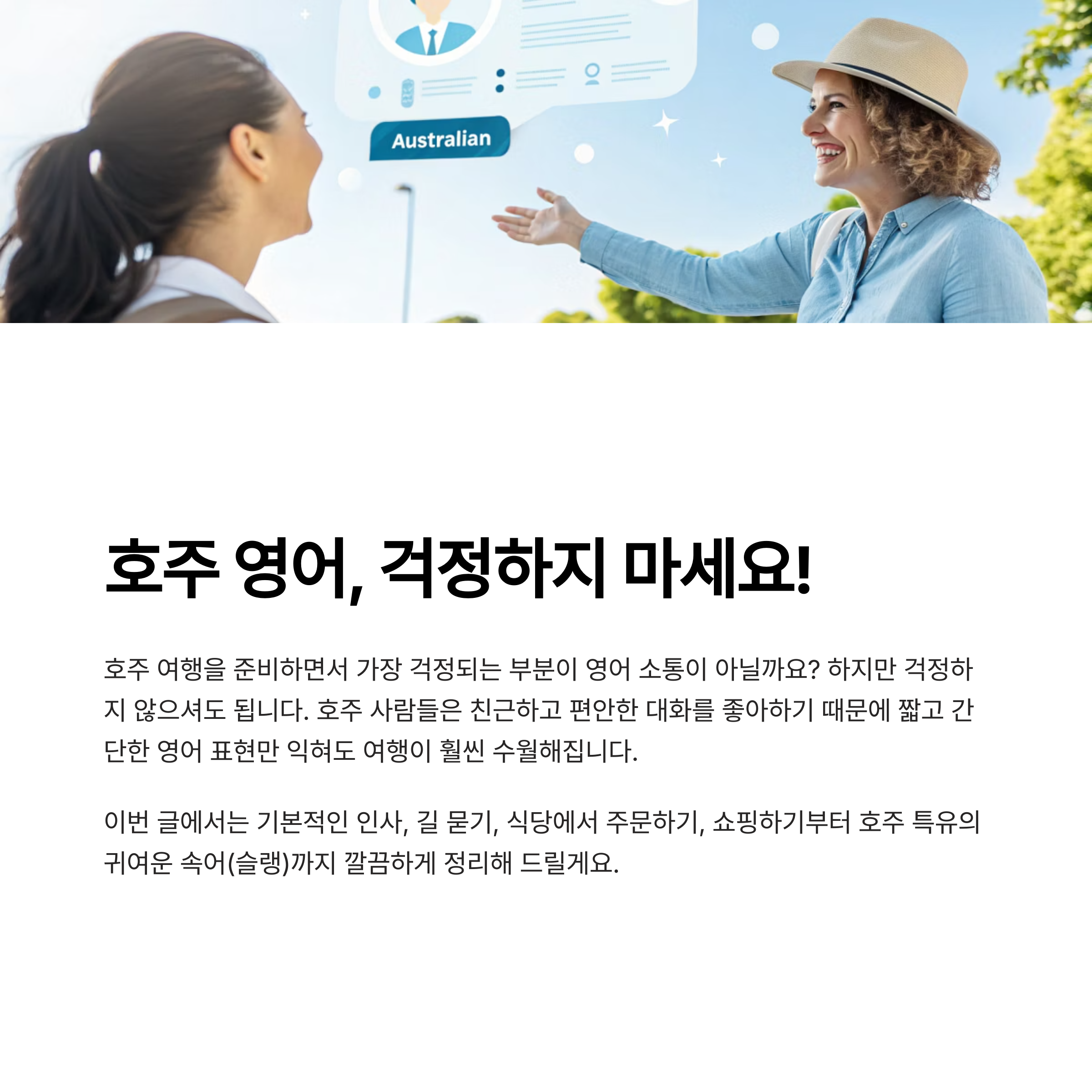 | 호주 여행 필수 영어 1, 꼭 알아야 할 필수 영어 표현 총정리 (2) | 2025.07.10 |