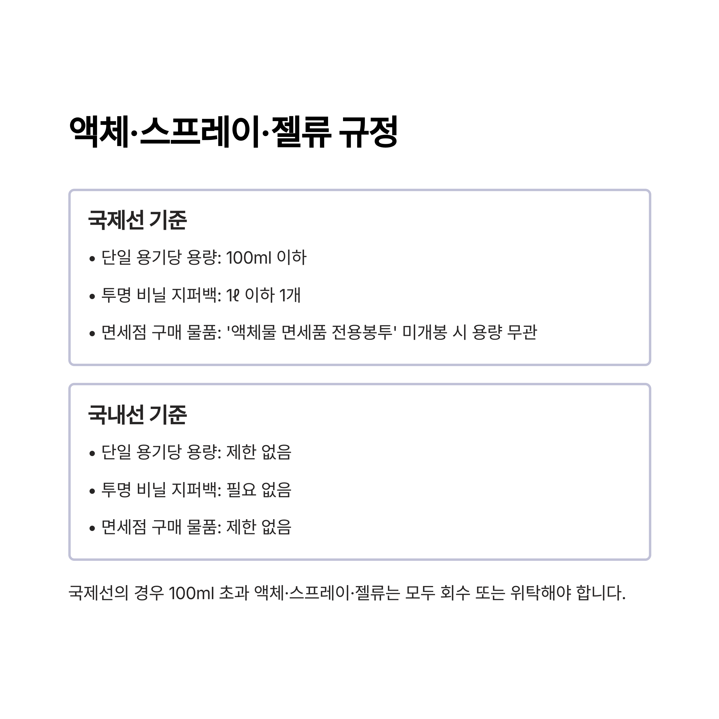 - 국제선은 100ml 이하 용기에 담아 총 1ℓ 이하 투명 지퍼백 1개에 넣어야 합니다.