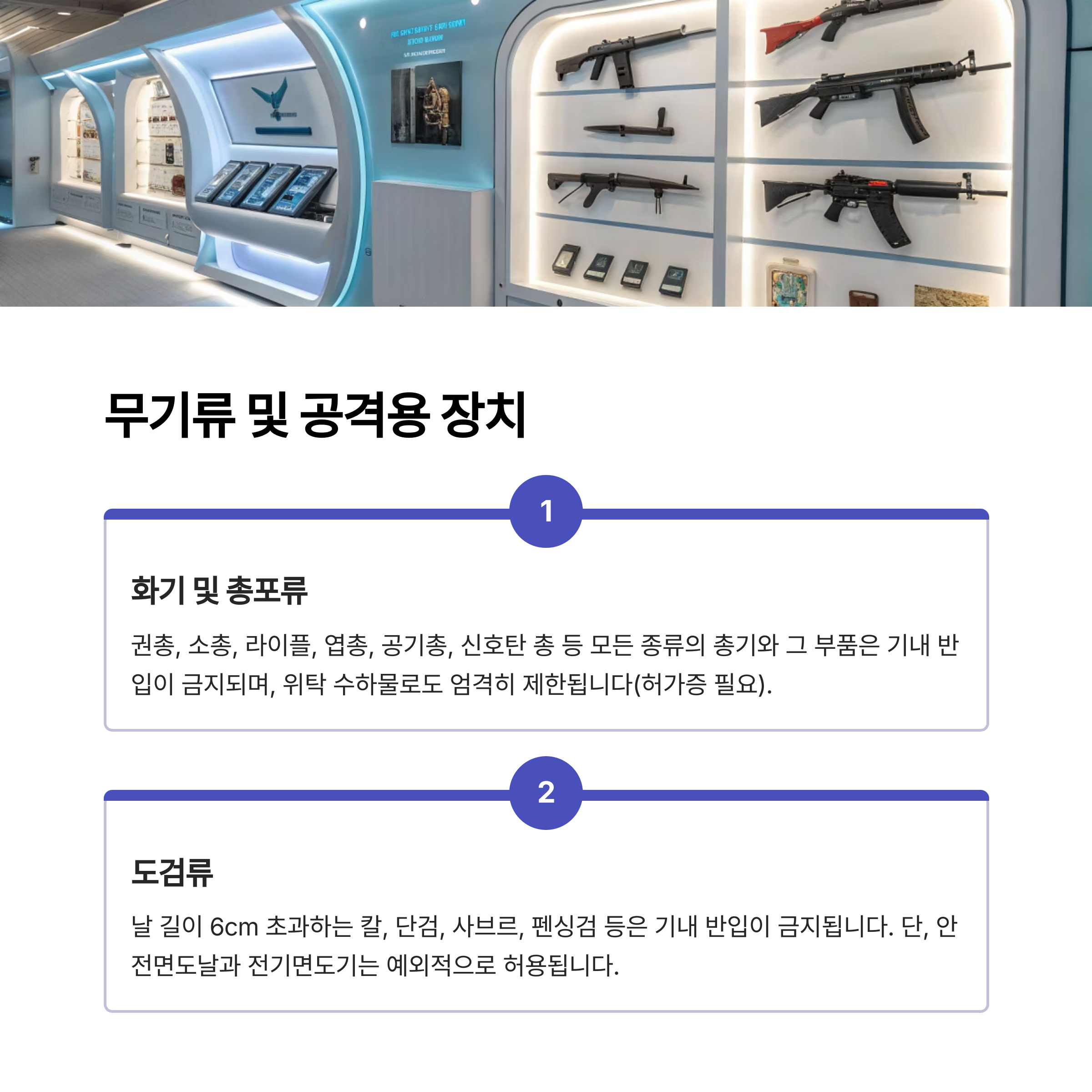 - 도검류(날 길이 6cm 초과 칼, 단검, 사브르, 펜싱검)는 반입 불가. 다만 안전면도날·전기면도기는 예외적으로 허용됩니다.