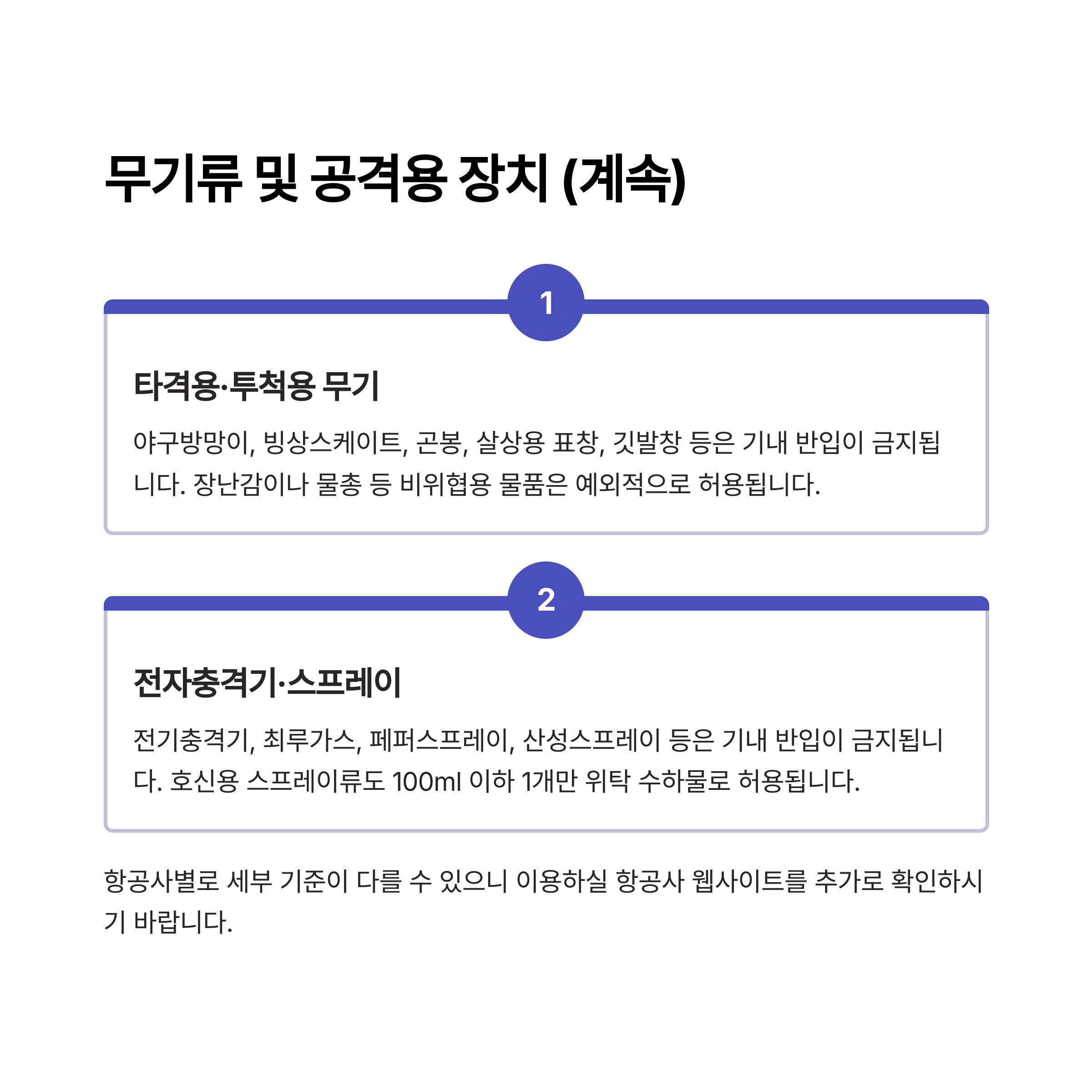 - 전자충격기, 최루가스, 페퍼스프레이는 위협 장치로 분류되어 금지되며, 호신용 스프레이는 100ml 이하 1개만 위탁 수하물로 제한적으로 허용됩니다.