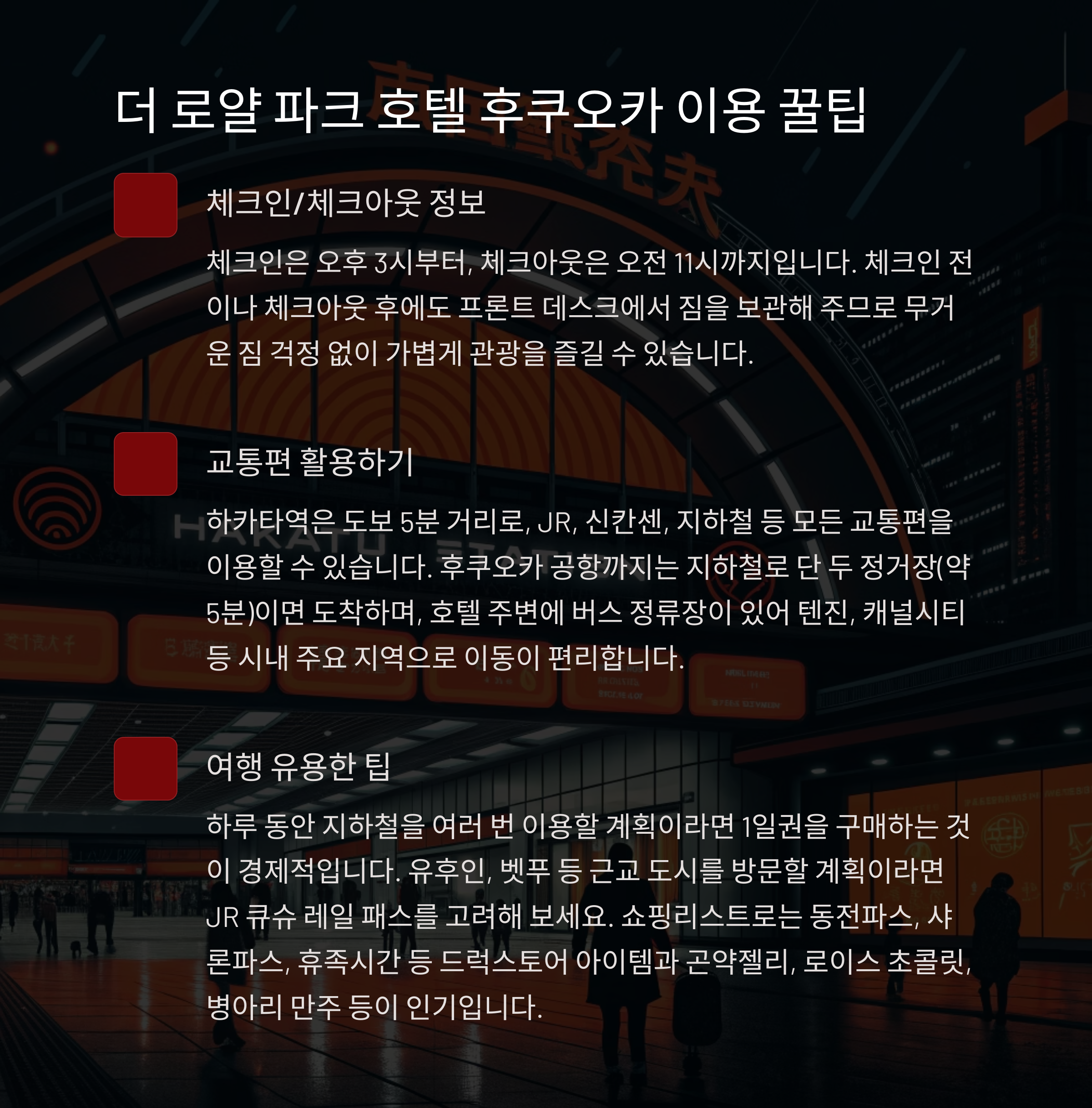 더 로얄 파크 호텔 후쿠오카를 200% 활용하고, 후쿠오카 여행을 더욱 편하게 즐길 수 있는 꿀팁들을 알려드립니다.